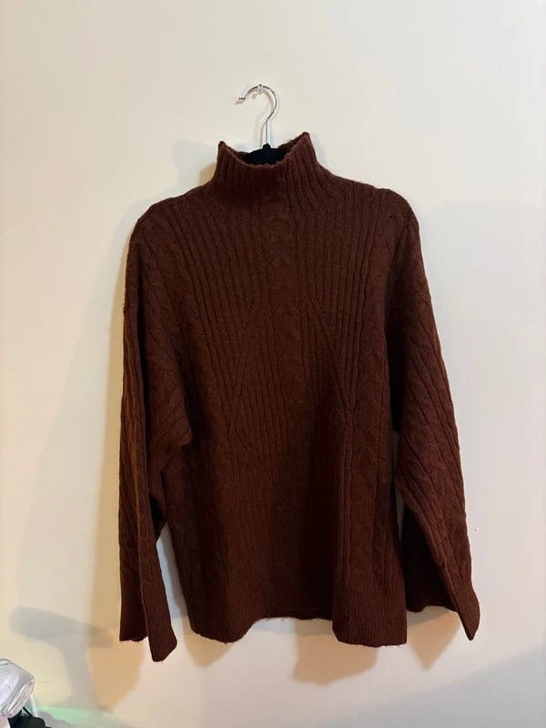 See all outfit ideasThis is a brown knitted sweater with a high neck and wide sleeves. Very comfortable and warm, it is labeled XS but could fit a S/M depending on the desired fit.