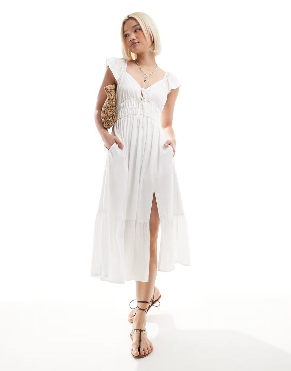 The Hollister Short Sleeve Milkmaid Midi Slit Dress in White is ideal for evening, party, date-night.