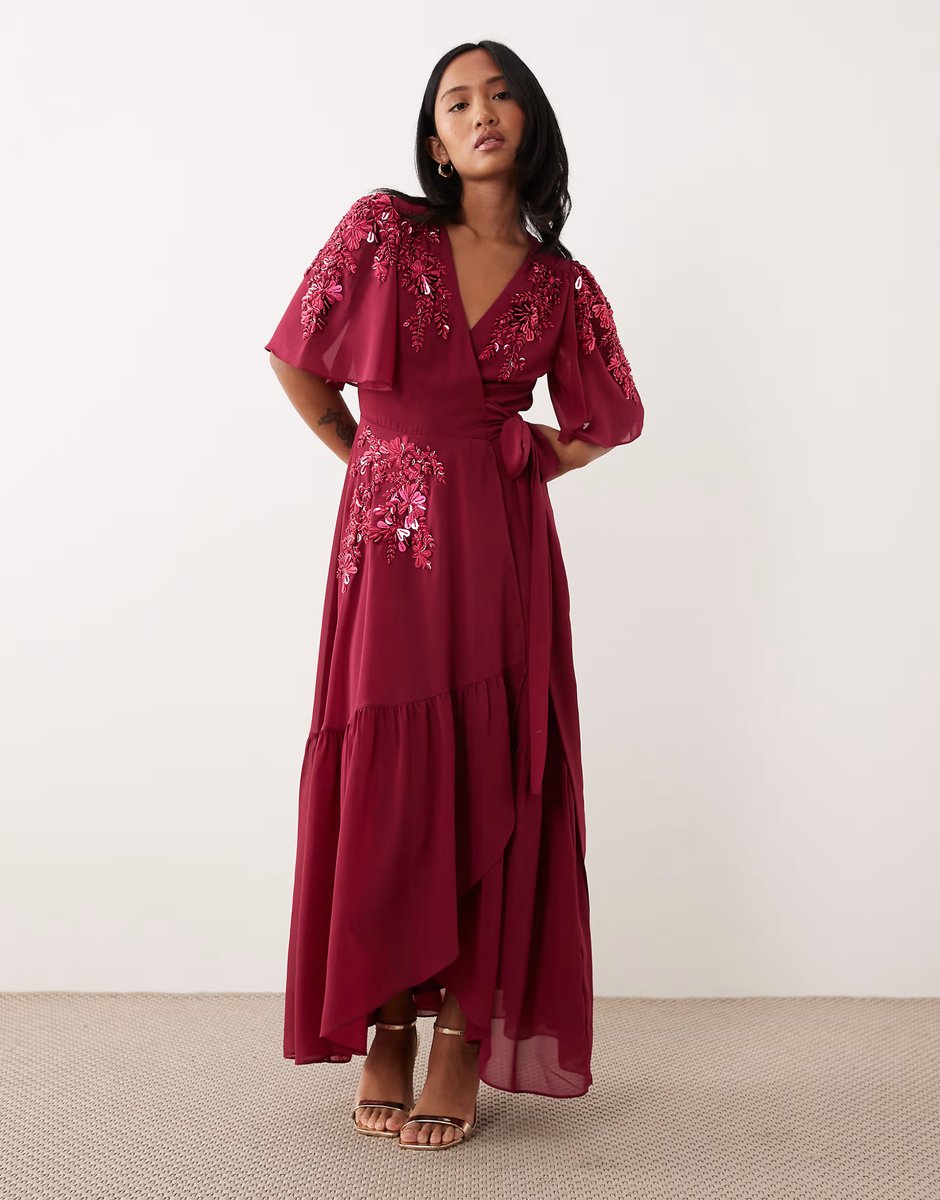 The Hope & Ivy Petite Embellished Wrap Front Maxi Dress in Fuchsia is ideal for evening, party, date-night.
