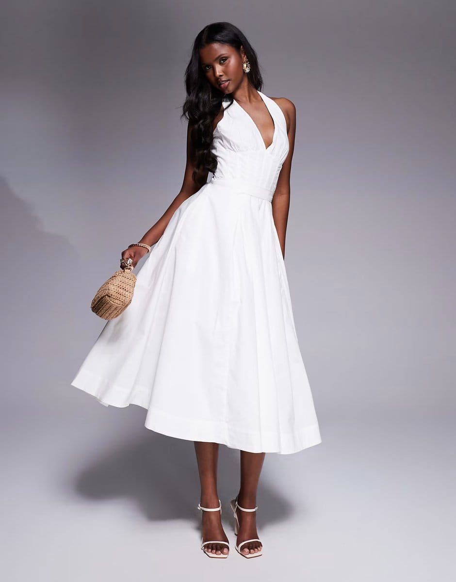 The ASOS House of CB Allena Cotton Halter Midi Sundress in White is ideal for casual, beach, party.