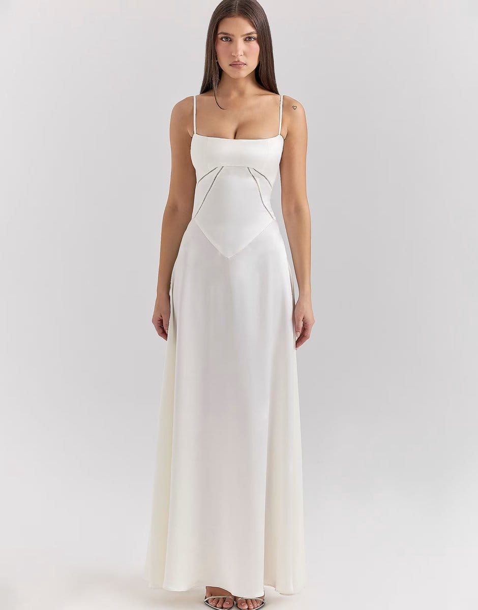 The House of CB Anabella Satin Lace-Up Maxi Dress in Ivory is ideal for evening, formal, wedding-guest.