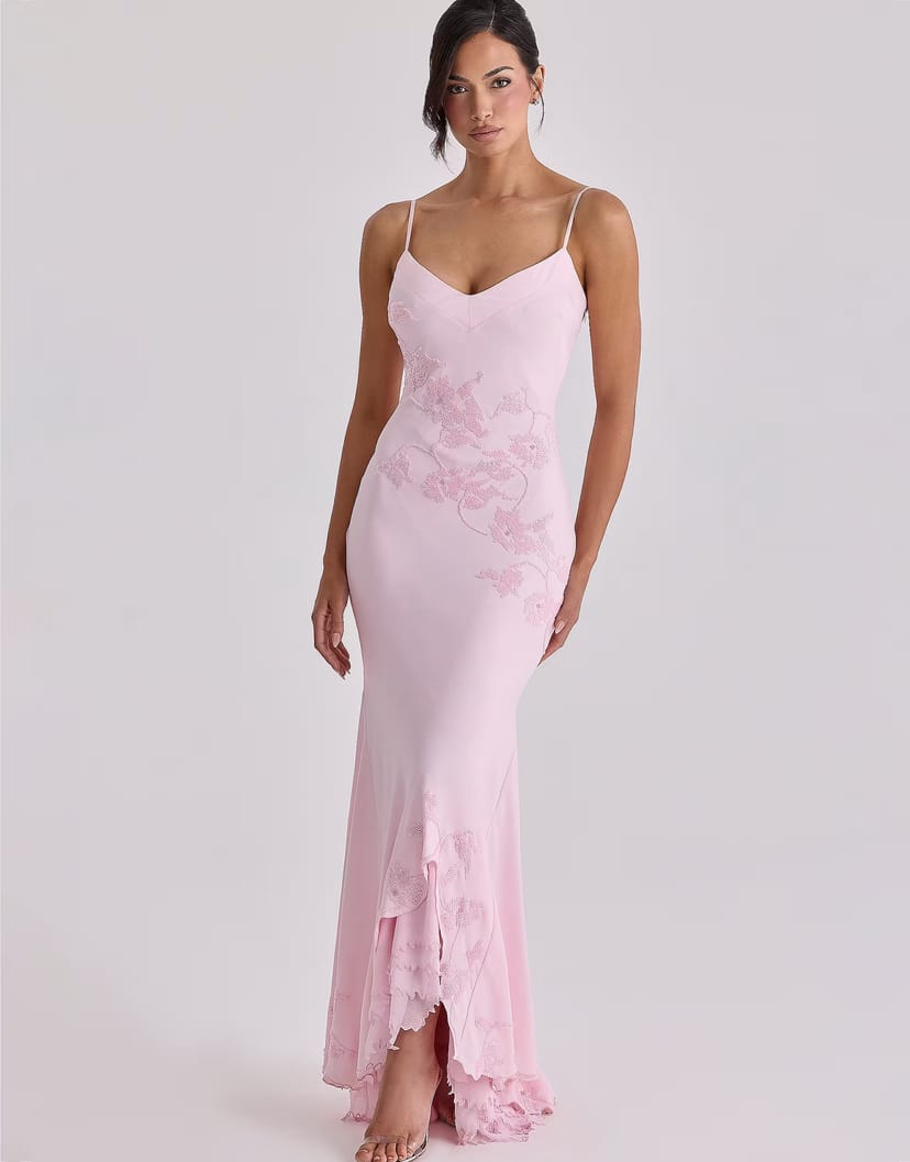 Elevate your evening style with the House of CB Anastelle pink hand beaded embellished satin maxi dress in pink. Featuring a deep V-neckline and a flowing silhouette, this dress is perfect for special occasions. The hand-beaded detailing adds a touch of elegance and sparkle.