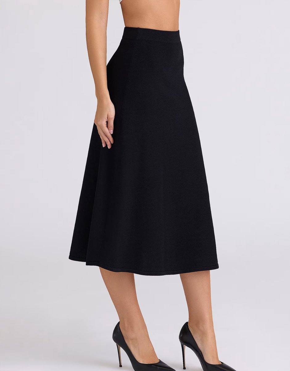 Elegant and versatile, this House of CB A-line midi skirt in black features a flattering a-line silhouette perfect for various occasions. Crafted with a smooth finish, it exudes sophistication.