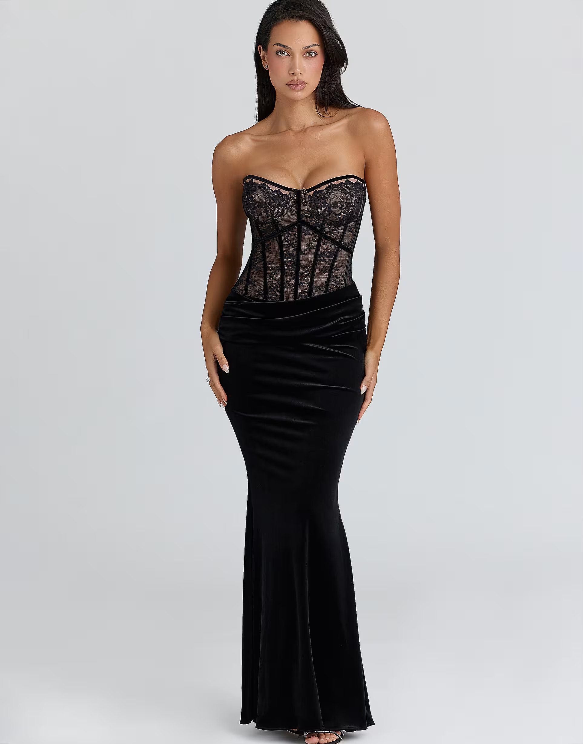 Featuring a black lace bodice with velvet skirt, this maxi dress by House of CB offers a figure-hugging fit that flatters the silhouette. Perfect for evening occasions with its elegant design.