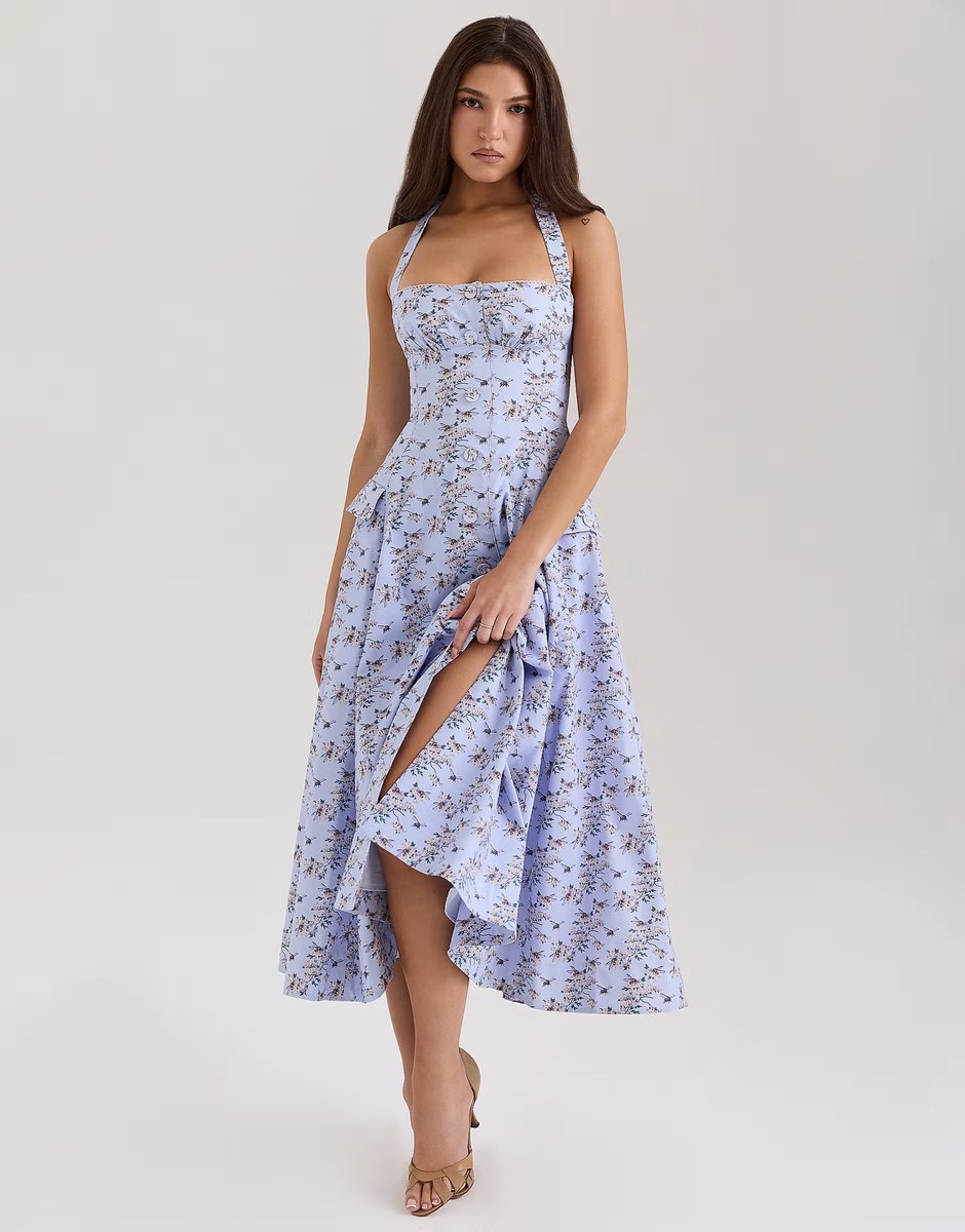 The ASOS House of CB Floral Halter Midi Dress in Blue is available in sizes XXXL, XXL, XL, XS, L, M, S.