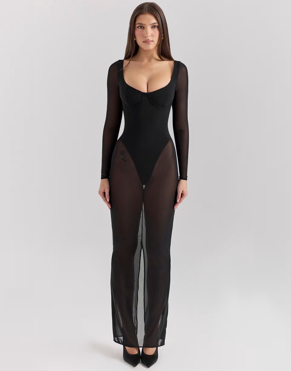 Crafted with a sleek, black sheer fabric, this maxi dress features a bodysuit design for a sultry and sophisticated look. Ideal for a night out, the dress exudes elegance and modernity.