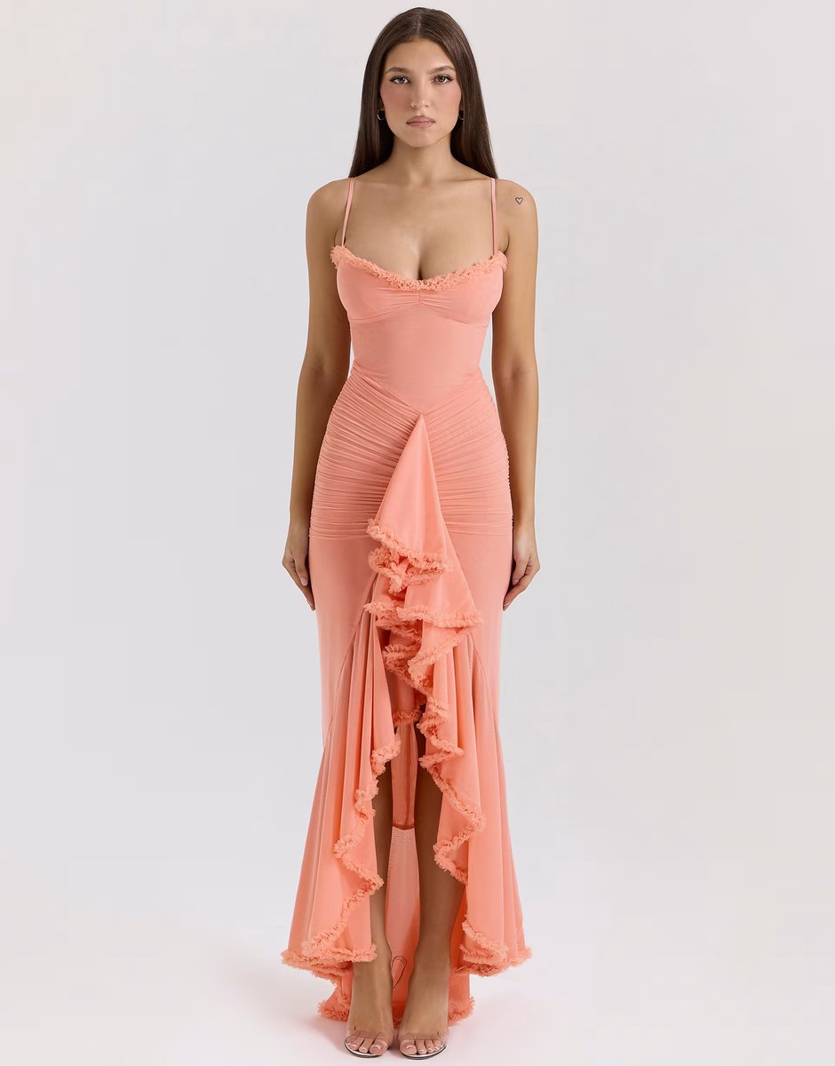 Elegant and chic, the House of CB gown features a ruffled front and a flowing silhouette. The peach hue adds a soft, feminine touch, making it perfect for special occasions.