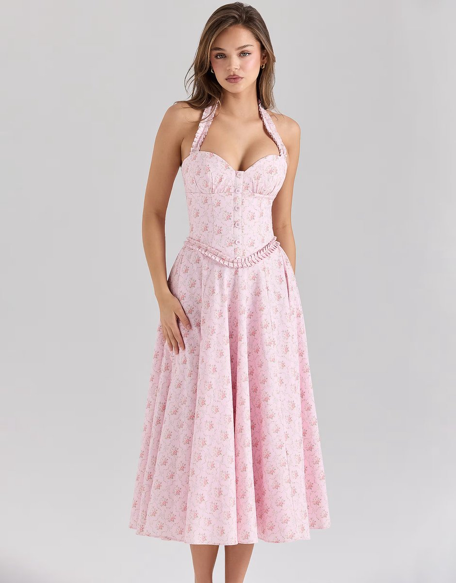 Elegant and playful, this pink rose print halter neck midi dress is crafted from stretch cotton for comfort and a flattering fit. Perfect for a casual yet elegant look.