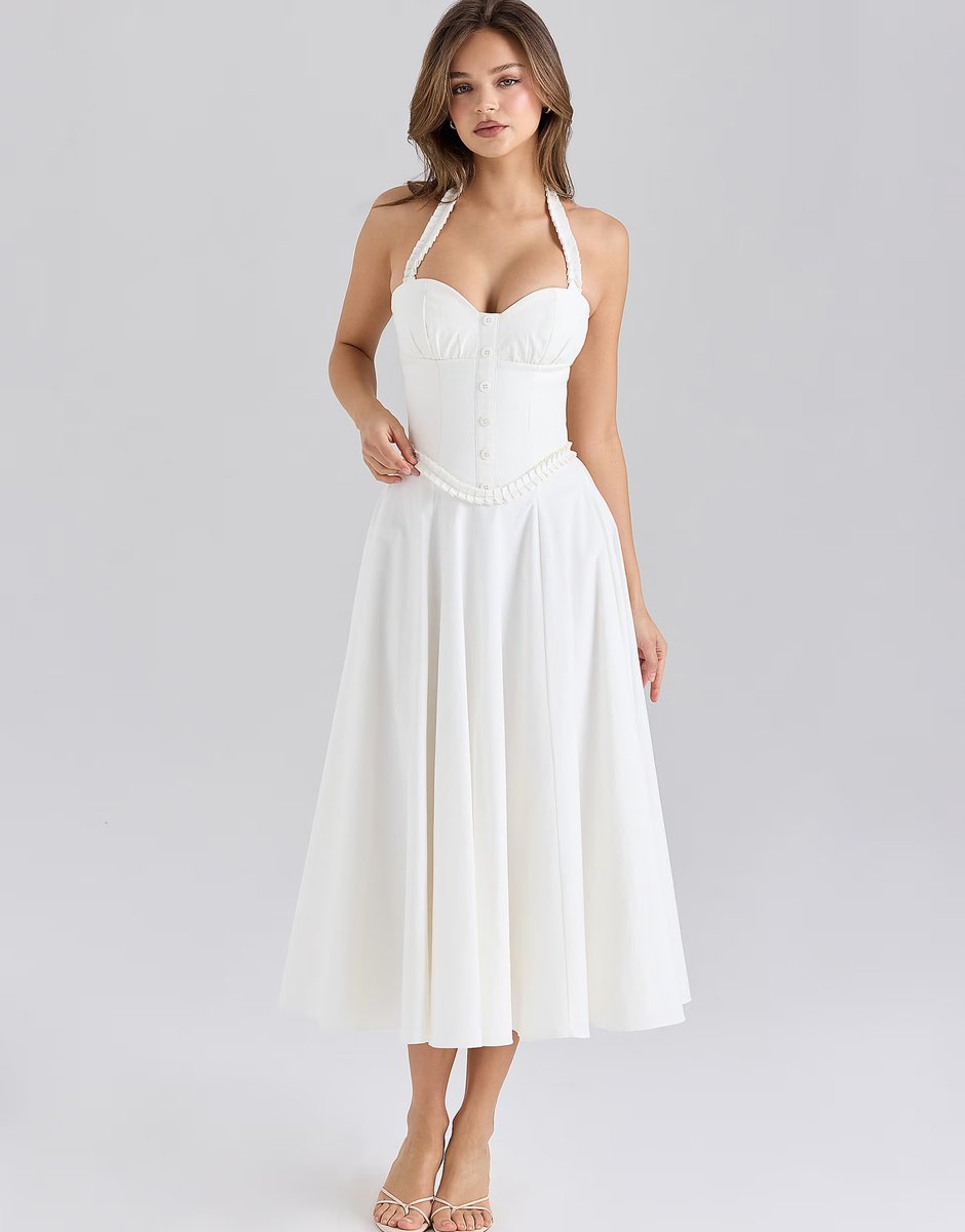 The ASOS House of CB Halter Neck Midi Dress in White is available in sizes XXXL, XXL, XL, XS, L, M, S.