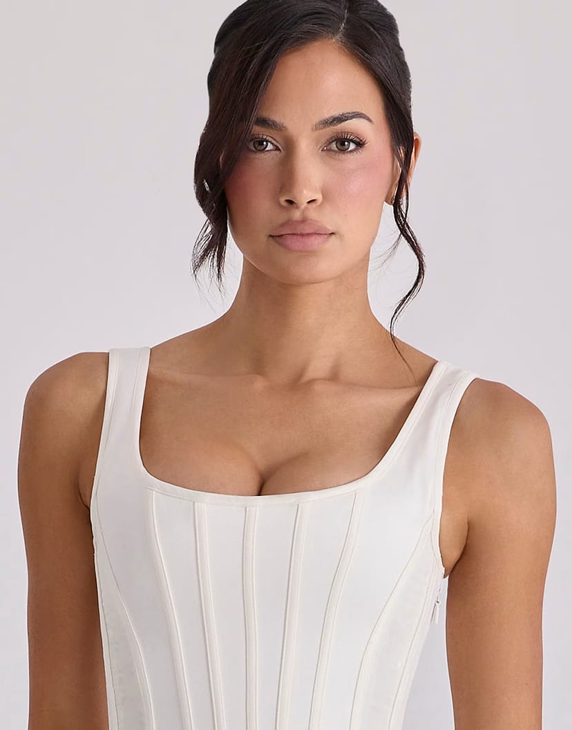 Sleek ivory satin bustier top by House of CB, featuring a strapless design with corset-style boning and a zipper closure. Ideal for evening events or special occasions.