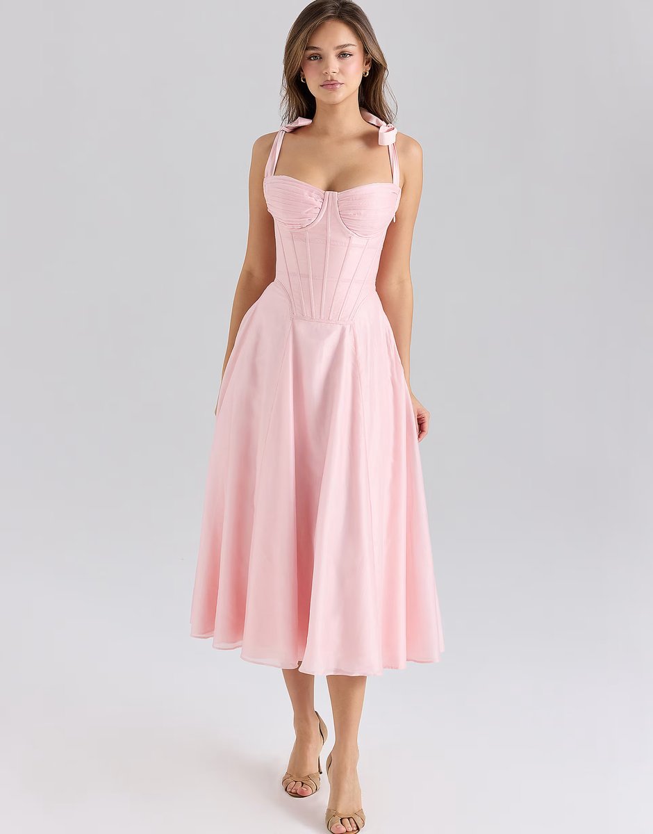 This House of CB Pink Chiffon Midi Dress features a sweetheart neckline, long sleeves, and a flattering A-line silhouette. Designed with a tie strap detail and crafted from lightweight chiffon fabric, it creates a feminine and romantic look perfect for special occasions.
