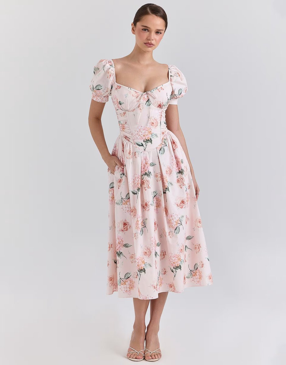 The House of CB Peach Floral Puff Sleeve Midi Dress is available in sizes XXXL, XXL, XL, XS, L, M, S.