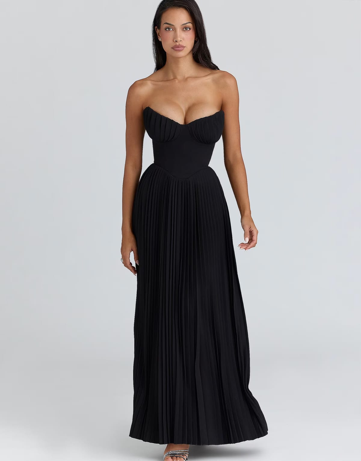 The ASOS House of CB Pleated Maxi Dress in Black is available in sizes XXXL, XXL, XL, XS, L, M, S.