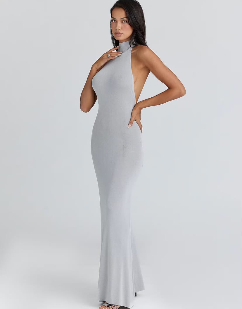 Designed with a halter neck, this maxi dress in silver grey features a backless design, perfect for evening events. Its flowing silhouette adds a touch of elegance.