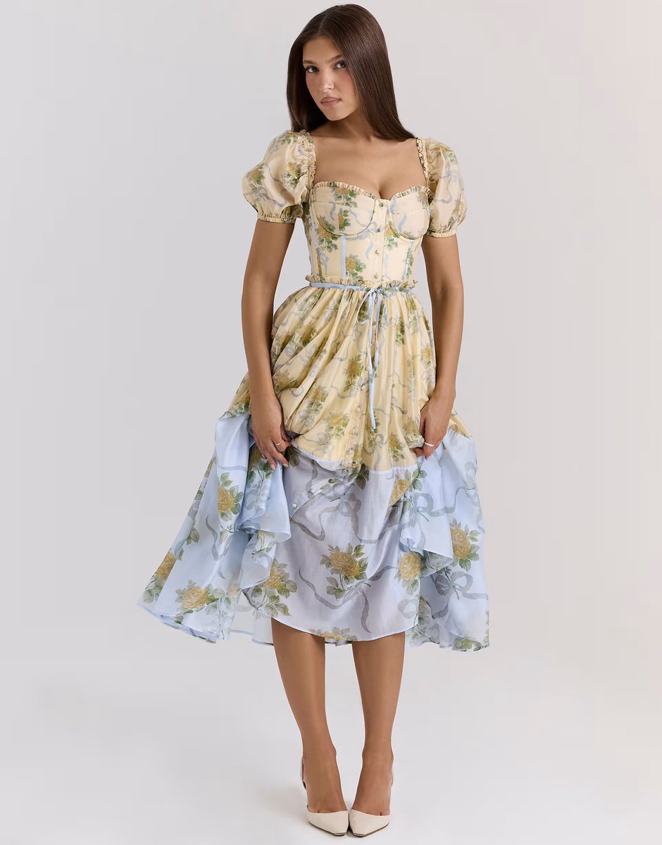 House of CB Penelope Midi Dress in Lemon Vintage Rose — the perfect blend of floral charm and vibrant color. Featuring a beautiful floral print, this midi dress boasts a fitted bodice with puff sleeves, an adjustable waist, and a flowing skirt. Crafted from cotton and polyester, it offers a lightweight and comfortable fit. Ideal for party occasions.