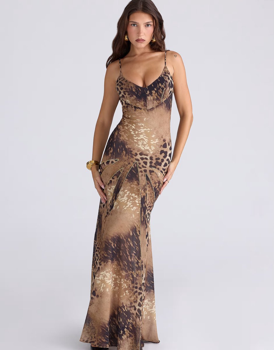 This leopard print maxi dress from House of CB is a statement piece designed for evening wear. Featuring panelled detailing and a flattering silhouette, it's perfect for a night out.