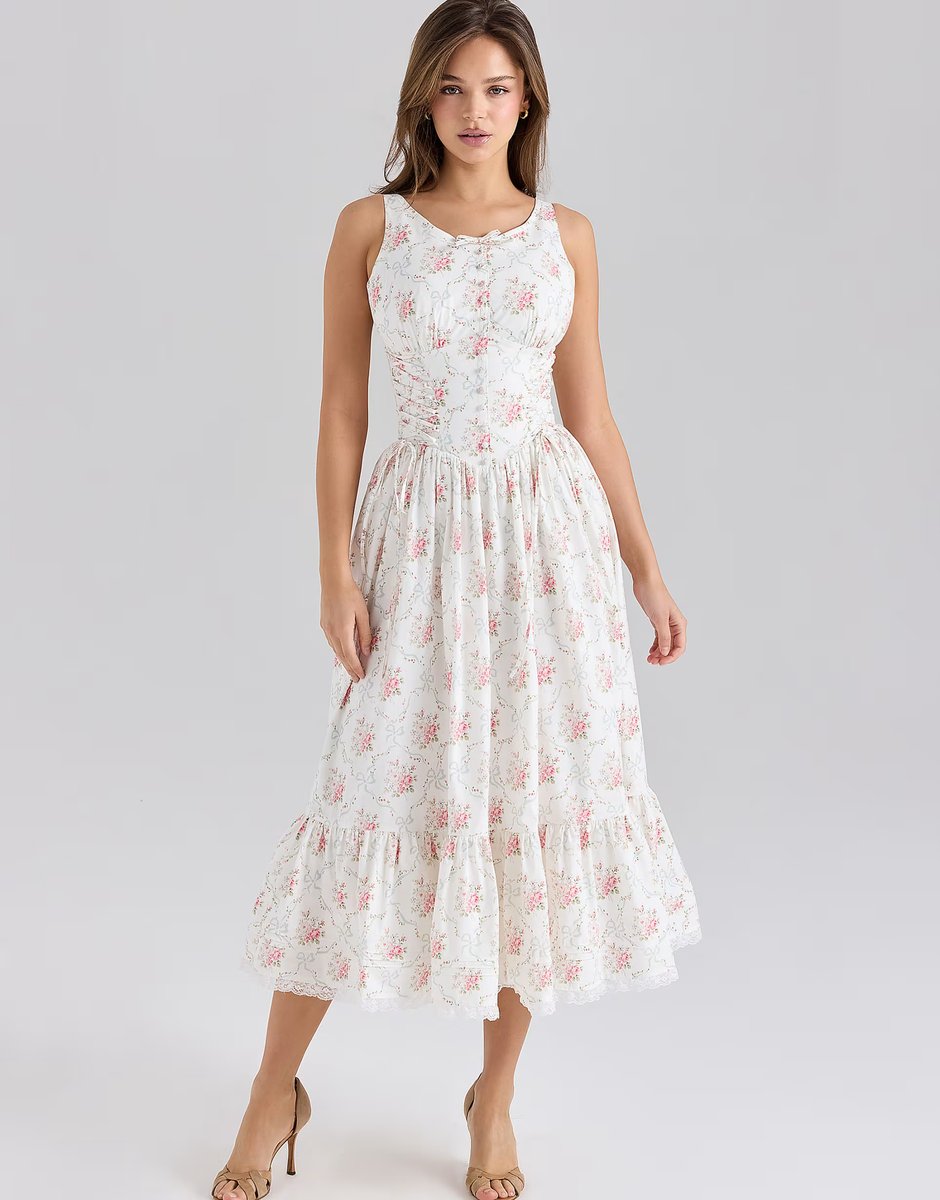 Elegant and feminine, this midi dress by House of CB features a rose print, lace-up detailing, and a flattering scoop neckline. Made from stretch cotton, it offers comfort and a graceful flow.