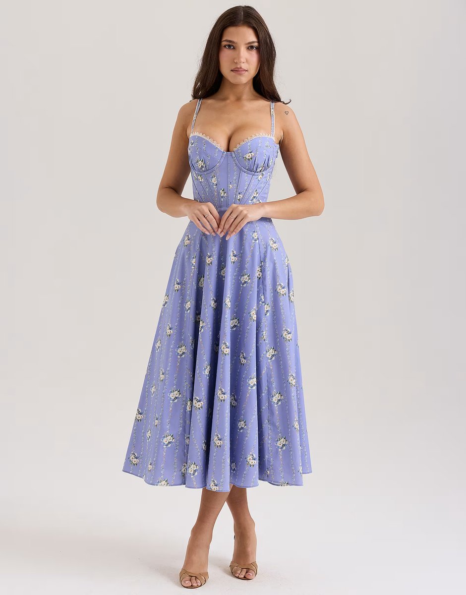 The House of CB Steffani Stretch Cotton Midi Sundress in Blue Daisy Print is ideal for party, beach, casual.