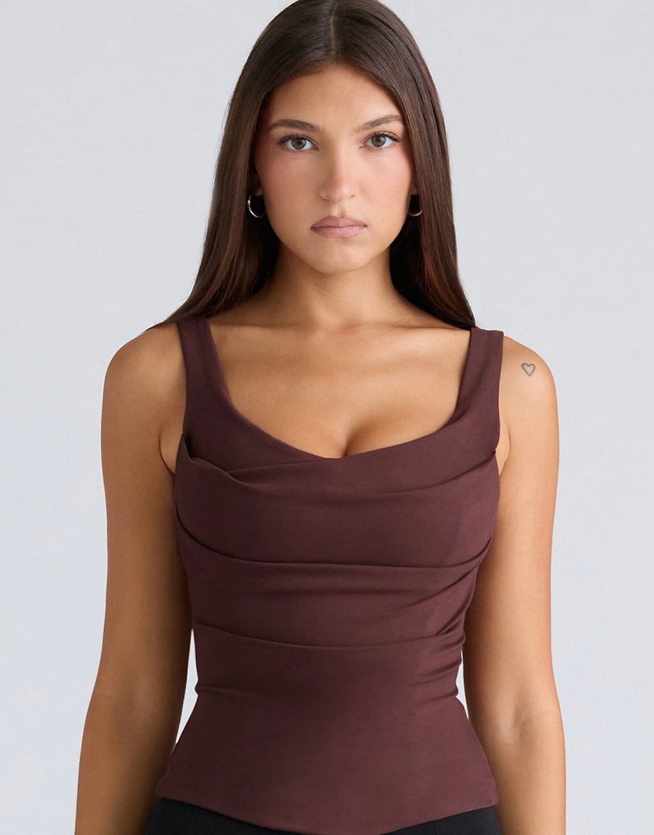 Brown V-Neckline Sleeveless Corset Top — the ultimate party piece for evening events and special occasions. Designed in rich chocolate brown, this sleeveless corset top boasts a deep V-neckline, a bandeau strap, and a sleek silhouette. Crafted from stretchy fabric with ruched detailing, it accentuates your figure beautifully. Ideal for adding a touch of drama to your night out look.