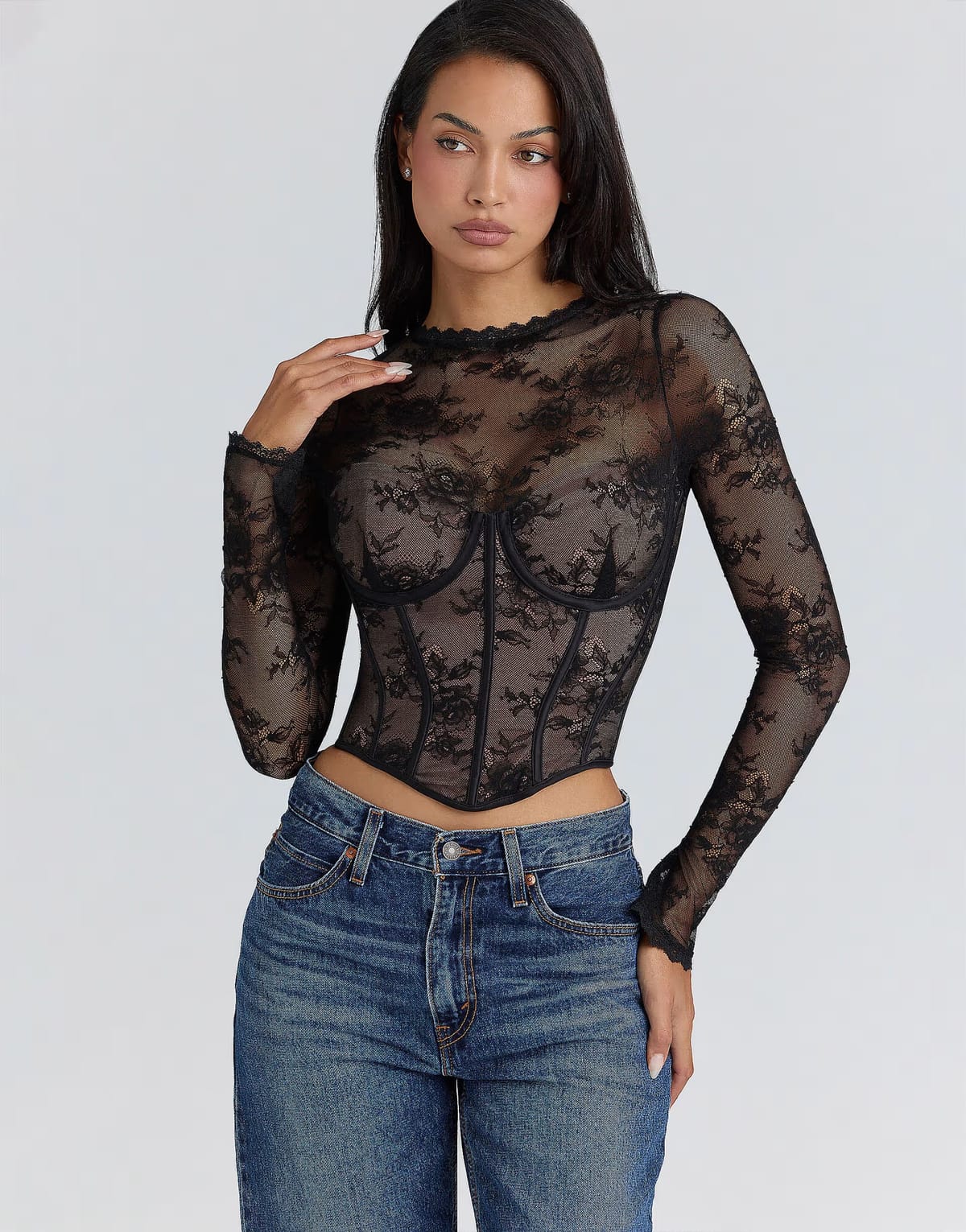 Stylish black lace long-sleeve corset top by House of CB. Features a sheer lace fabric with intricate floral patterns and a corset-like structure that cinches at the waist. Perfect for adding a touch of elegance to your evening outfits.