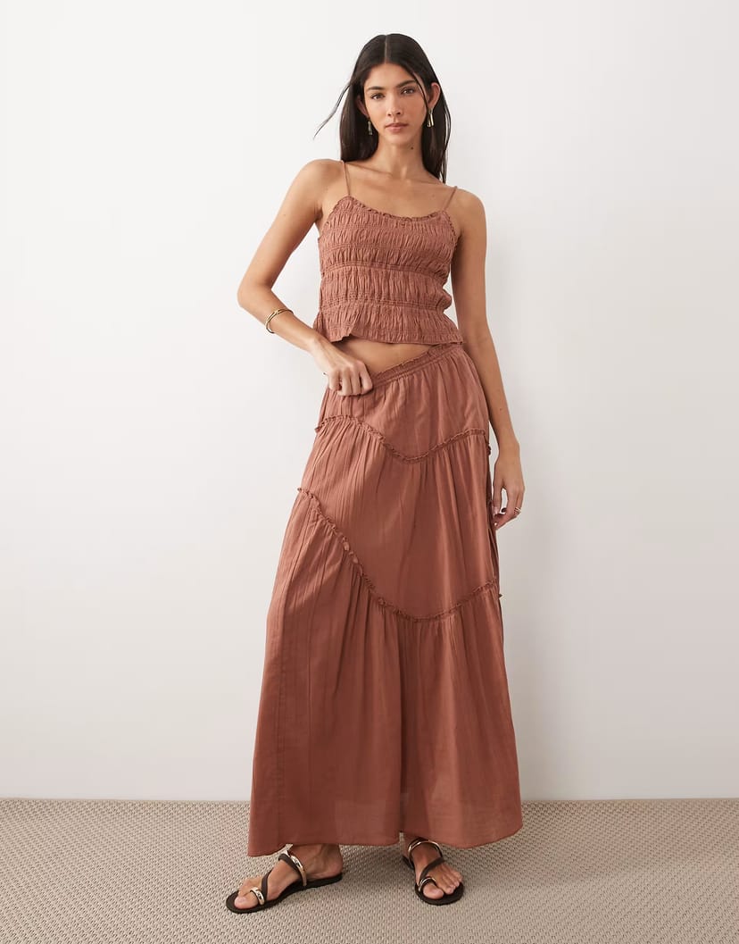 See all outfit ideasThis mocha brown maxi skirt from ASOS features a tiered ruffle design and a smocked waistband. Made from a lightweight, flowing fabric, it offers a voluminous and full look. Perfect for casual outings or beachwear.