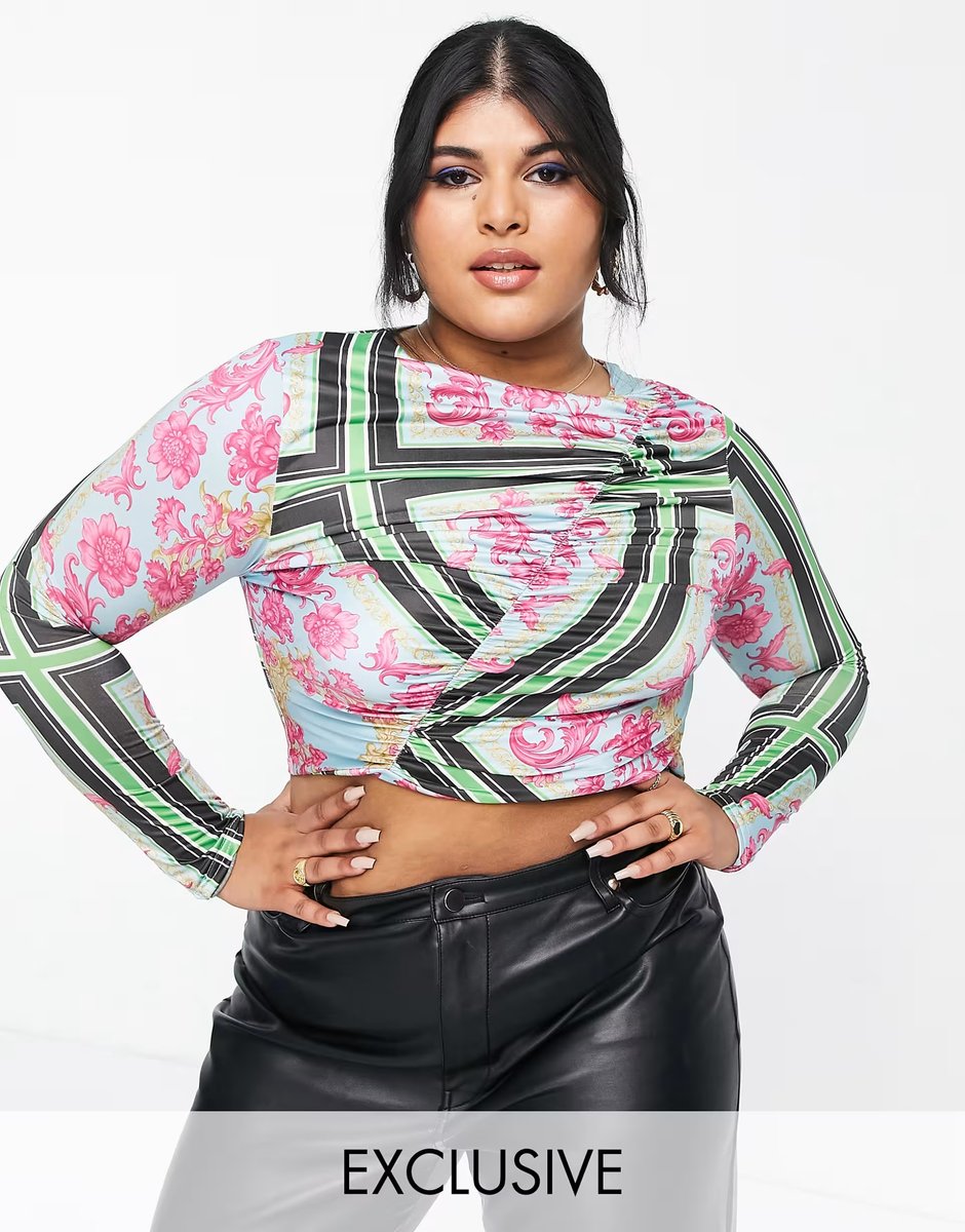 The In The Style Plus x Liberty Exclusive Ruche Long Sleeve Crop Top Co-ord in Multi Floral is ideal for casual, party, evening.