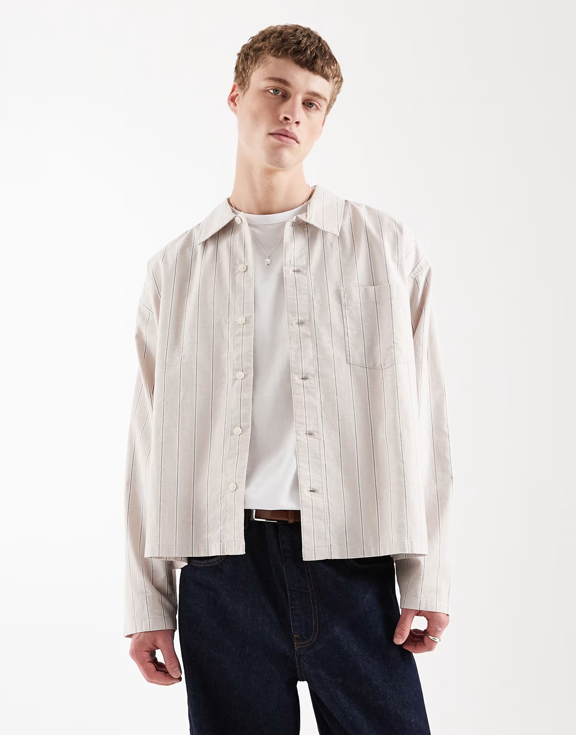 The ASOS Jack & Jones Boxy Long Sleeve Shirt in Beige is ideal for casual, business-casual.