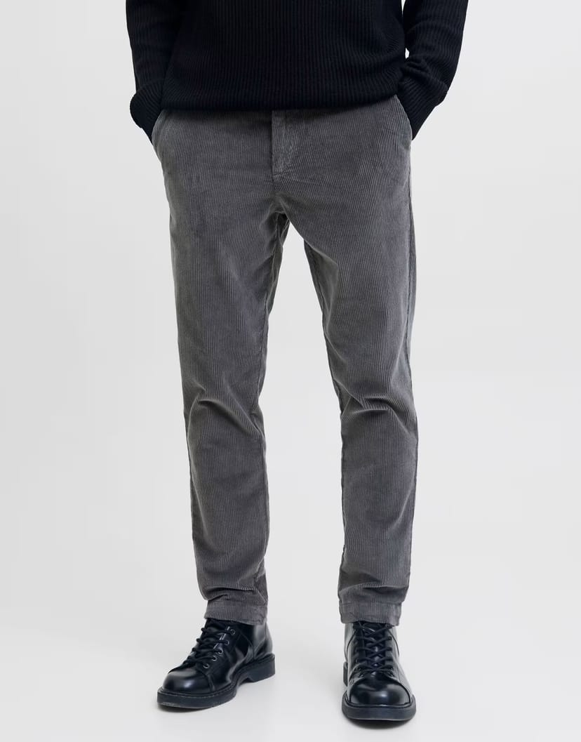The ASOS Jack & Jones Cord Trousers in Charcoal Grey is made from corduroy.