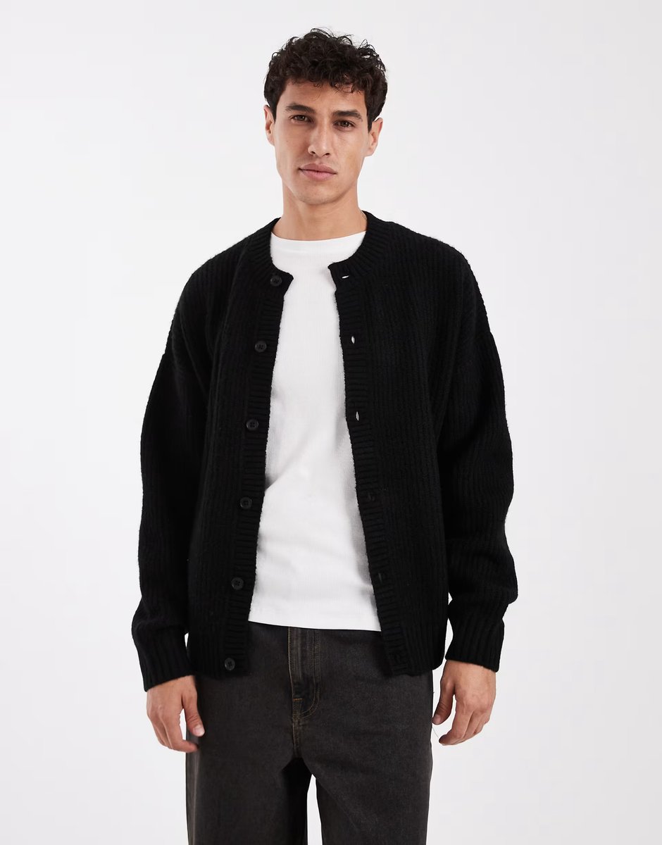 The ASOS Jack & Jones Crew Neck Cardigan in Black is ideal for casual, work.