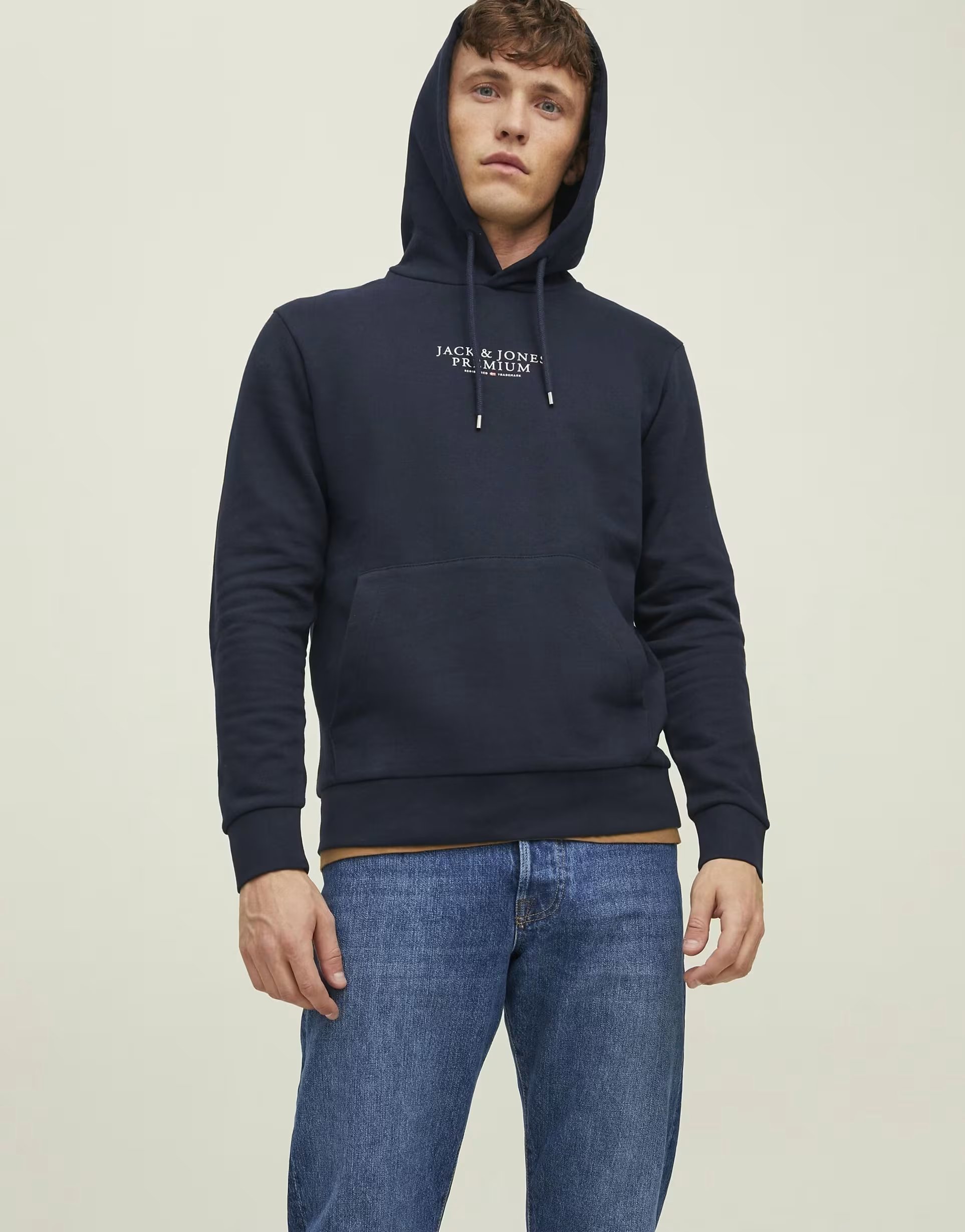 The ASOS Jack & Jones Hoodie in Navy Blazer is available in sizes XXXL, XXL, XL, XS, L, M, S.