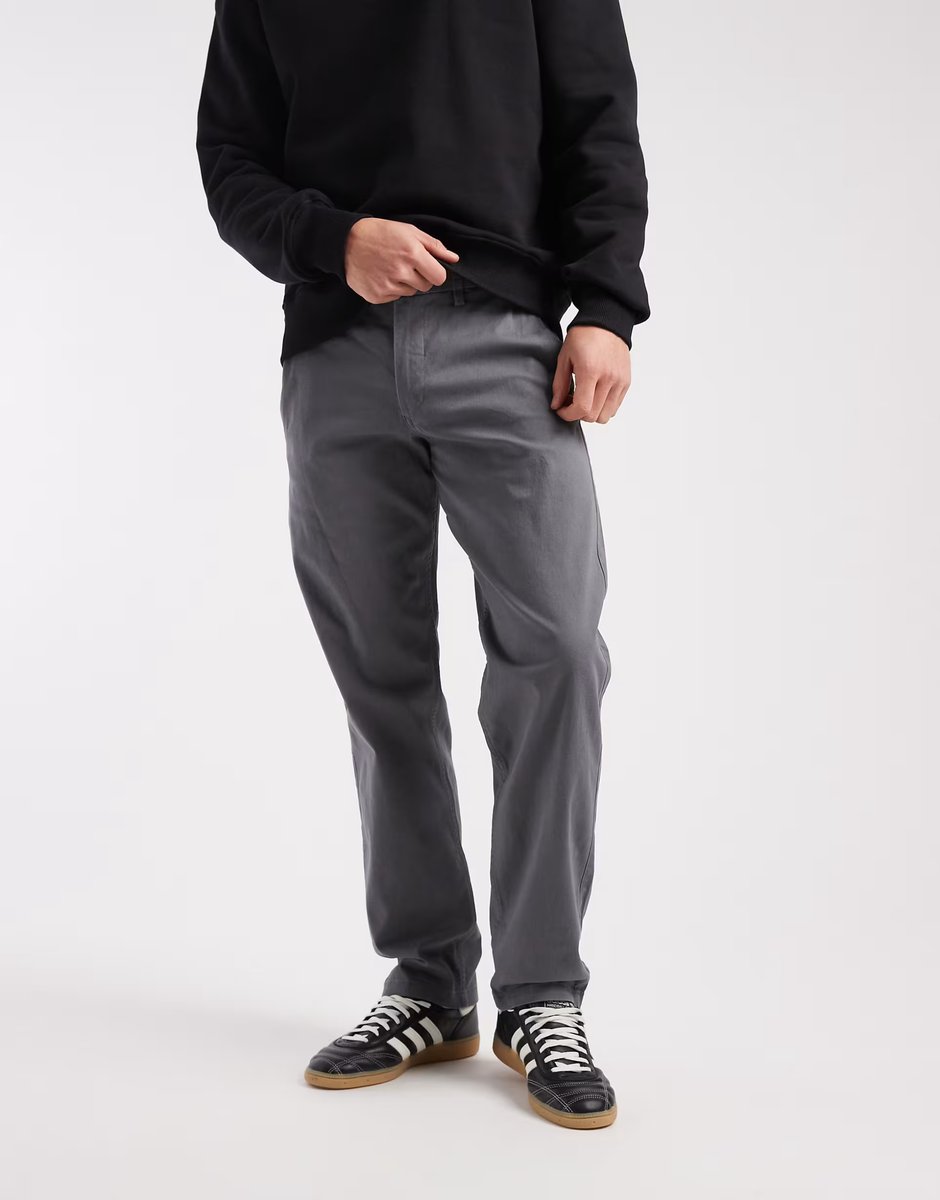 Jack & Jones loose fit chino trousers in grey fabric. Designed with a loose fit, zip fly closure, and button fly. Perfect for casual, business-casual, and weekend occasions.