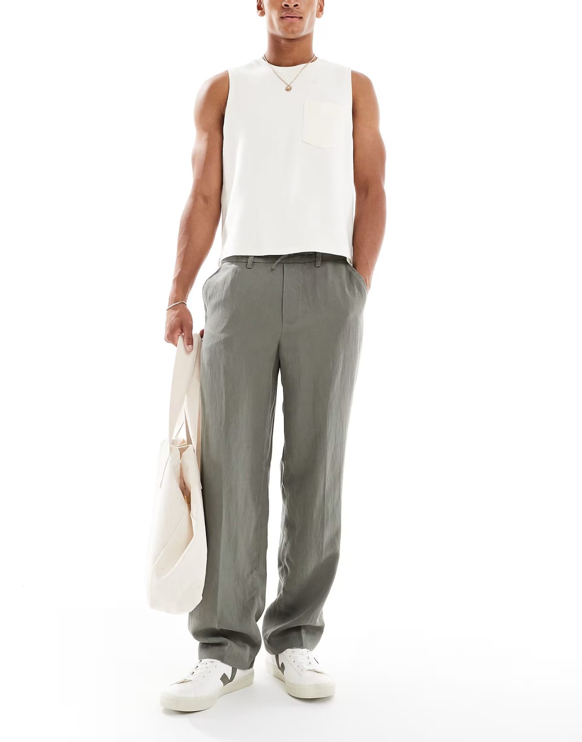 The ASOS Jack & Jones Khaki Lightweight Drawstring Trouser is made from lightweight fabric.