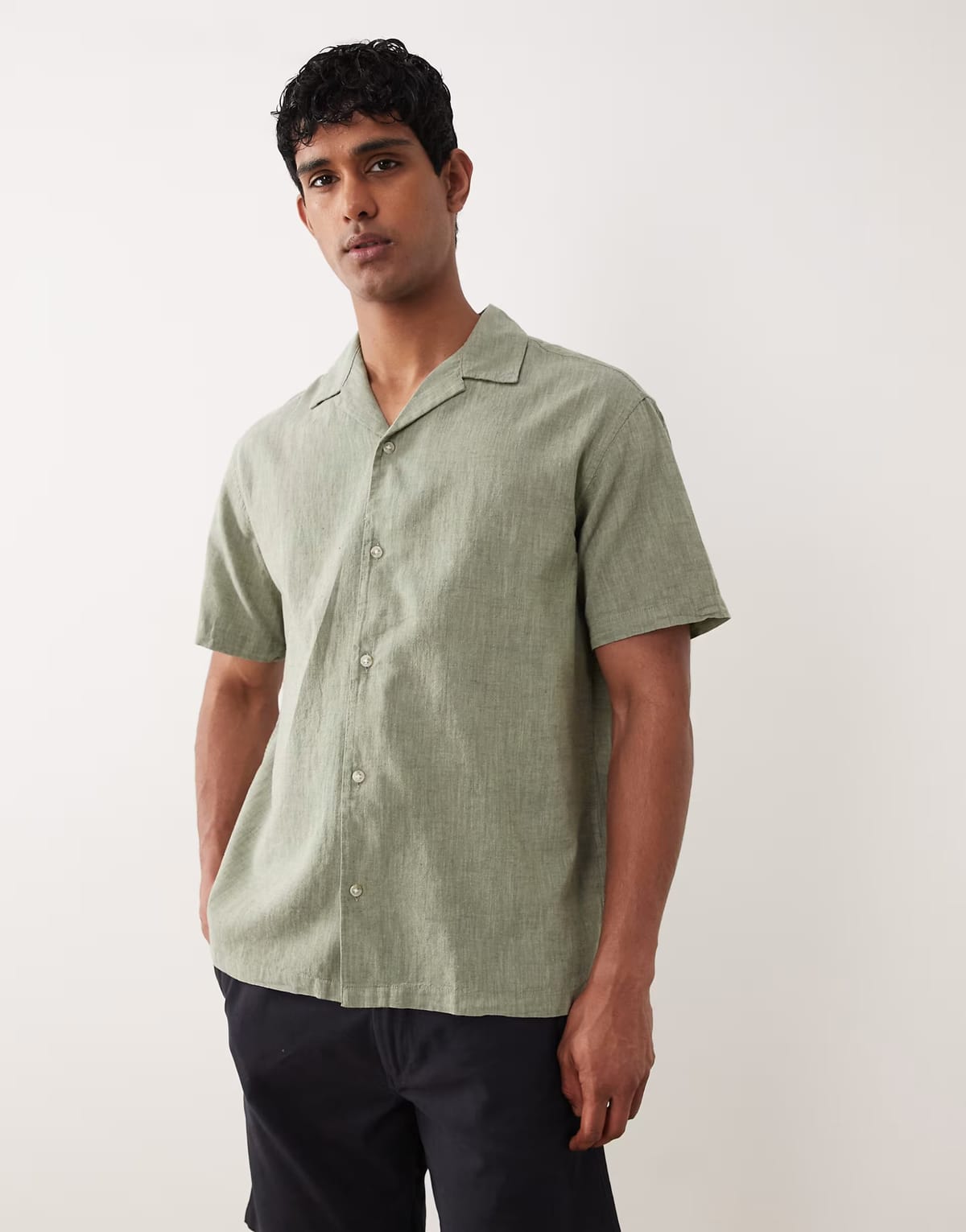 Stylish Jack & Jones shirt in sage green linen mix. Features a revere collar, button-down front, and a casual fit. Ideal for smart-casual occasions.