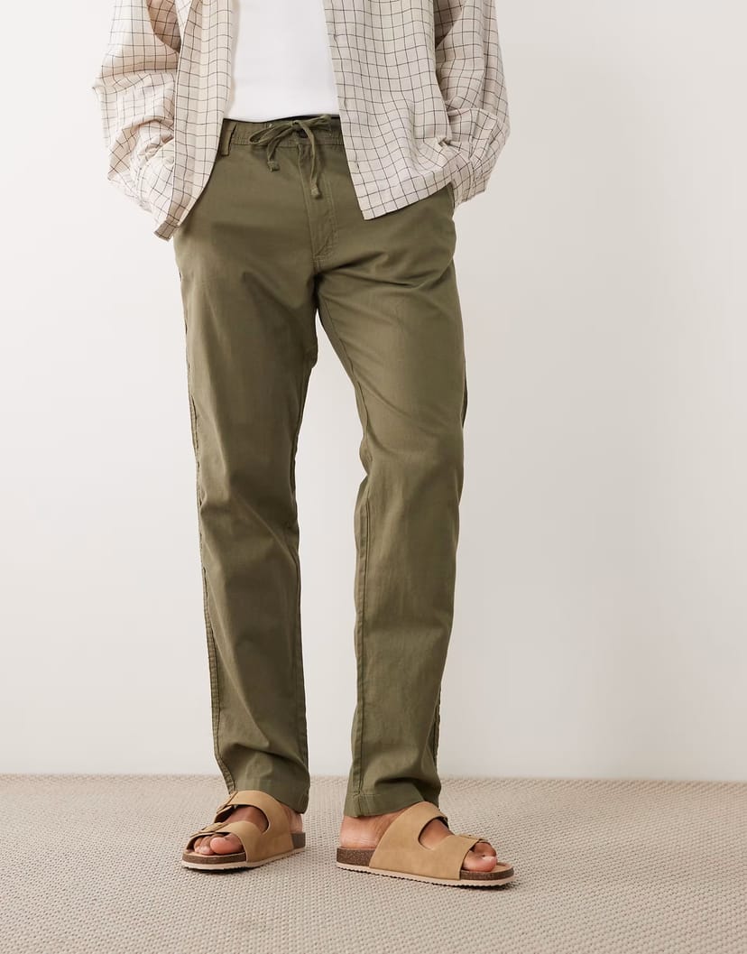 Stylish Jack & Jones trousers in a deep lichen green linen mix. These trousers feature a straight-leg silhouette and adjustable drawstring waist for a comfortable fit. Ideal for casual and smart-casual occasions.