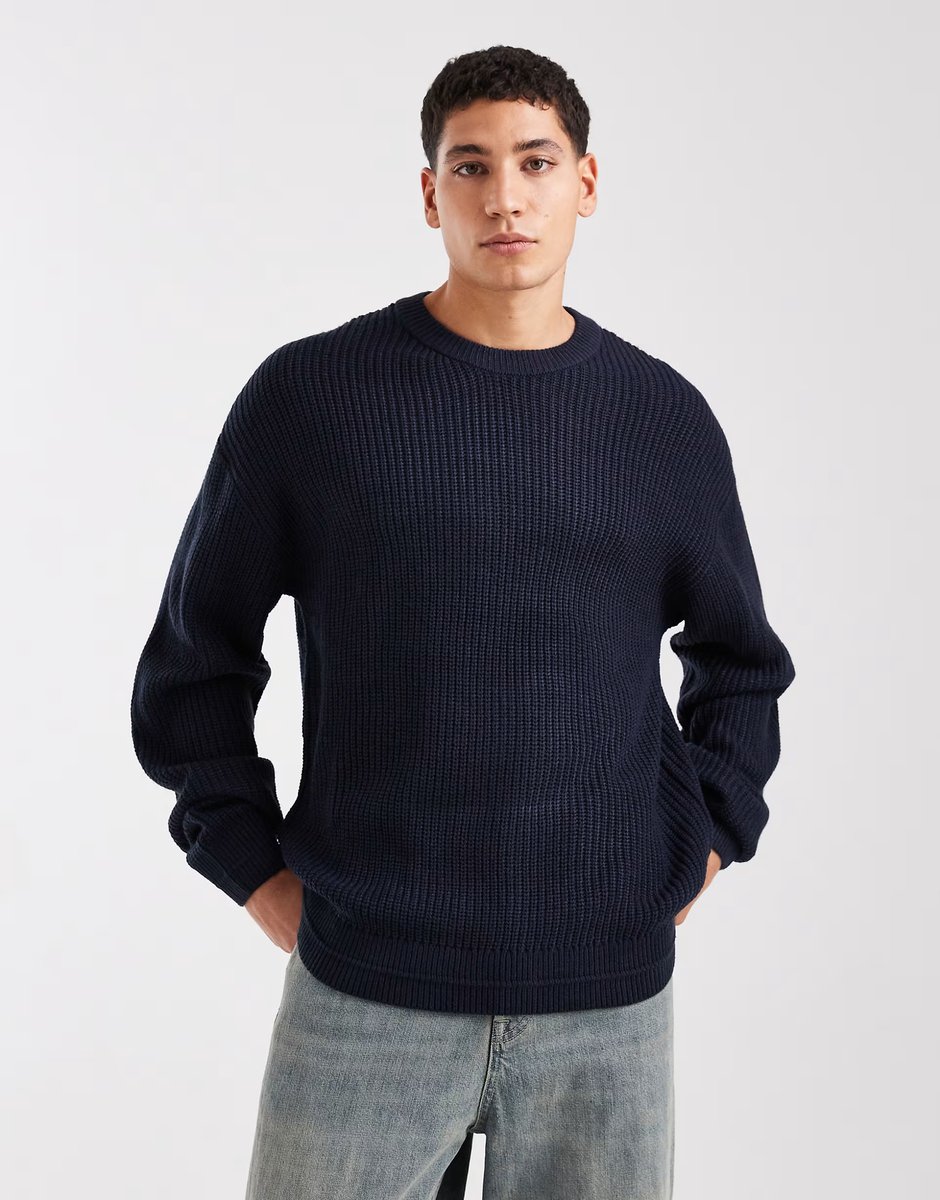 The ASOS Jack & Jones Oversize Chunky Knit Jumper in Navy is ideal for casual, cool weather.