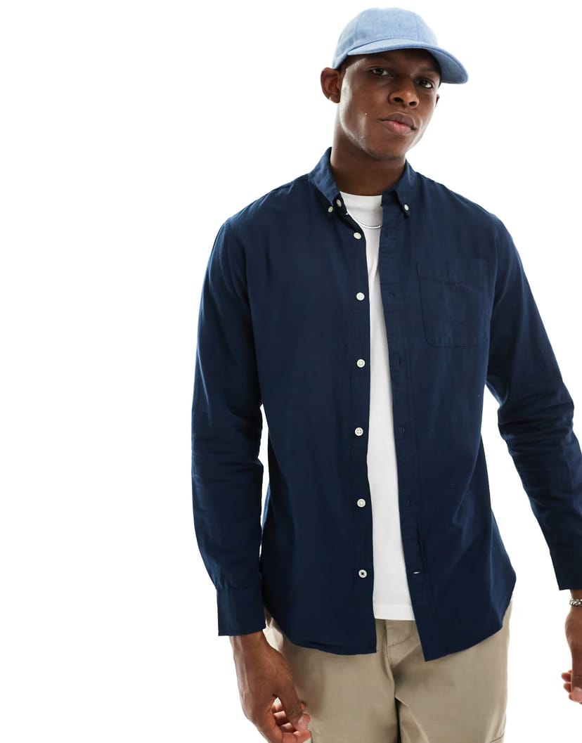 The ASOS Jack & Jones Oxford Shirt in Navy is made from oxford fabric.