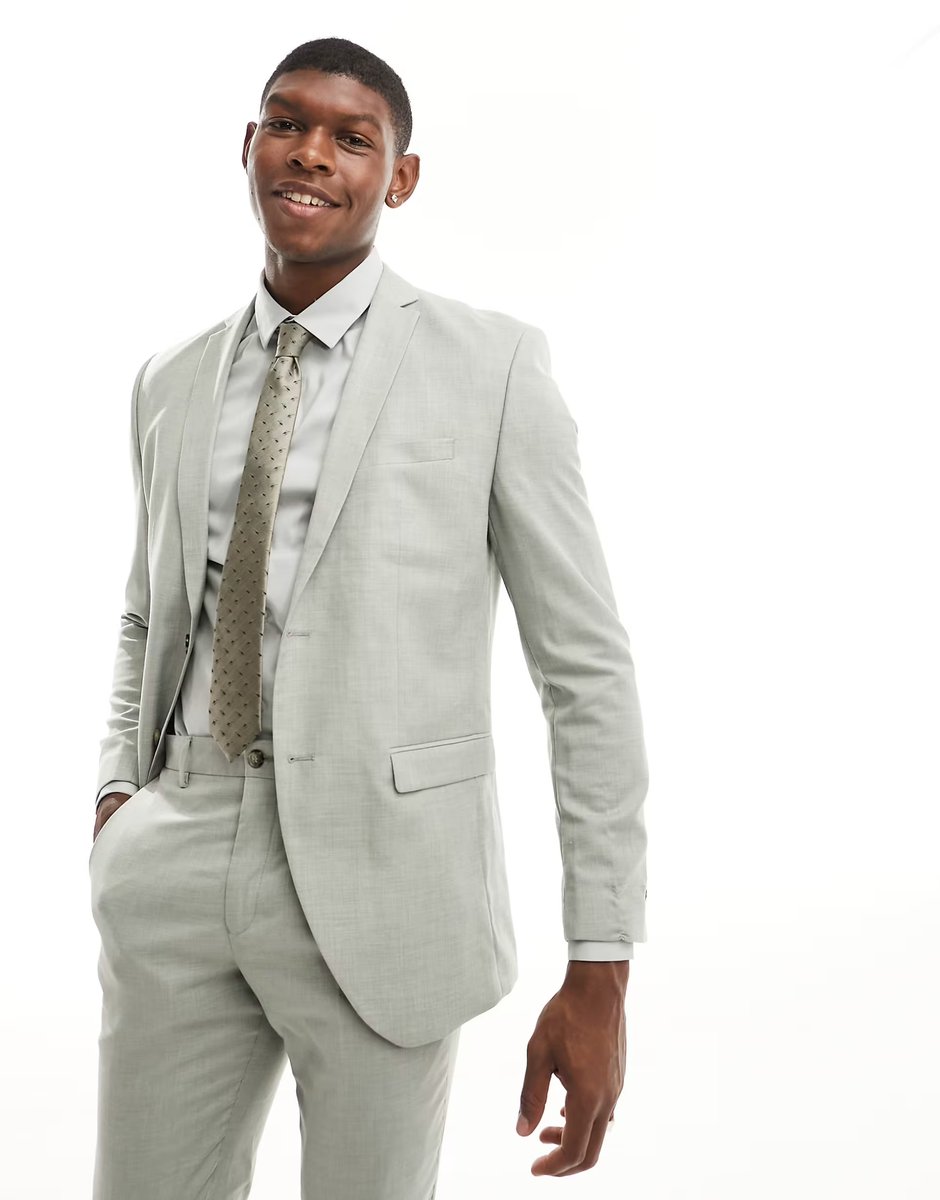 The ASOS Jack & Jones Slim Fit Suit Jacket in Pale Green is available in sizes XXXL, XXL, XL, XS, L, M, S.