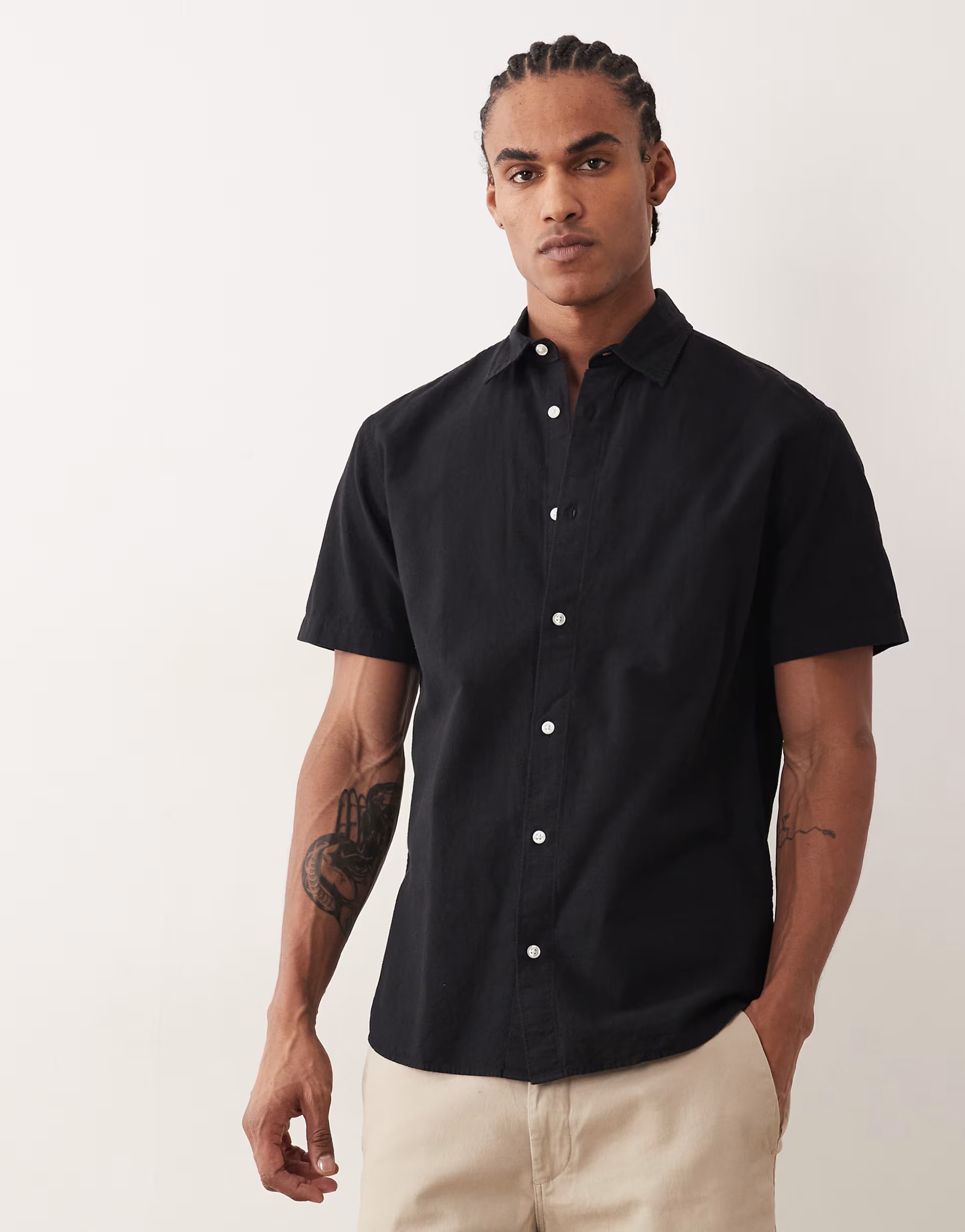 This black short sleeve shirt from Jack & Jones at ASOS offers a classic fit with button-down collar, perfect for versatile styling. Crafted from a blend of linen and other fibers, it ensures a breathable and comfortable feel.