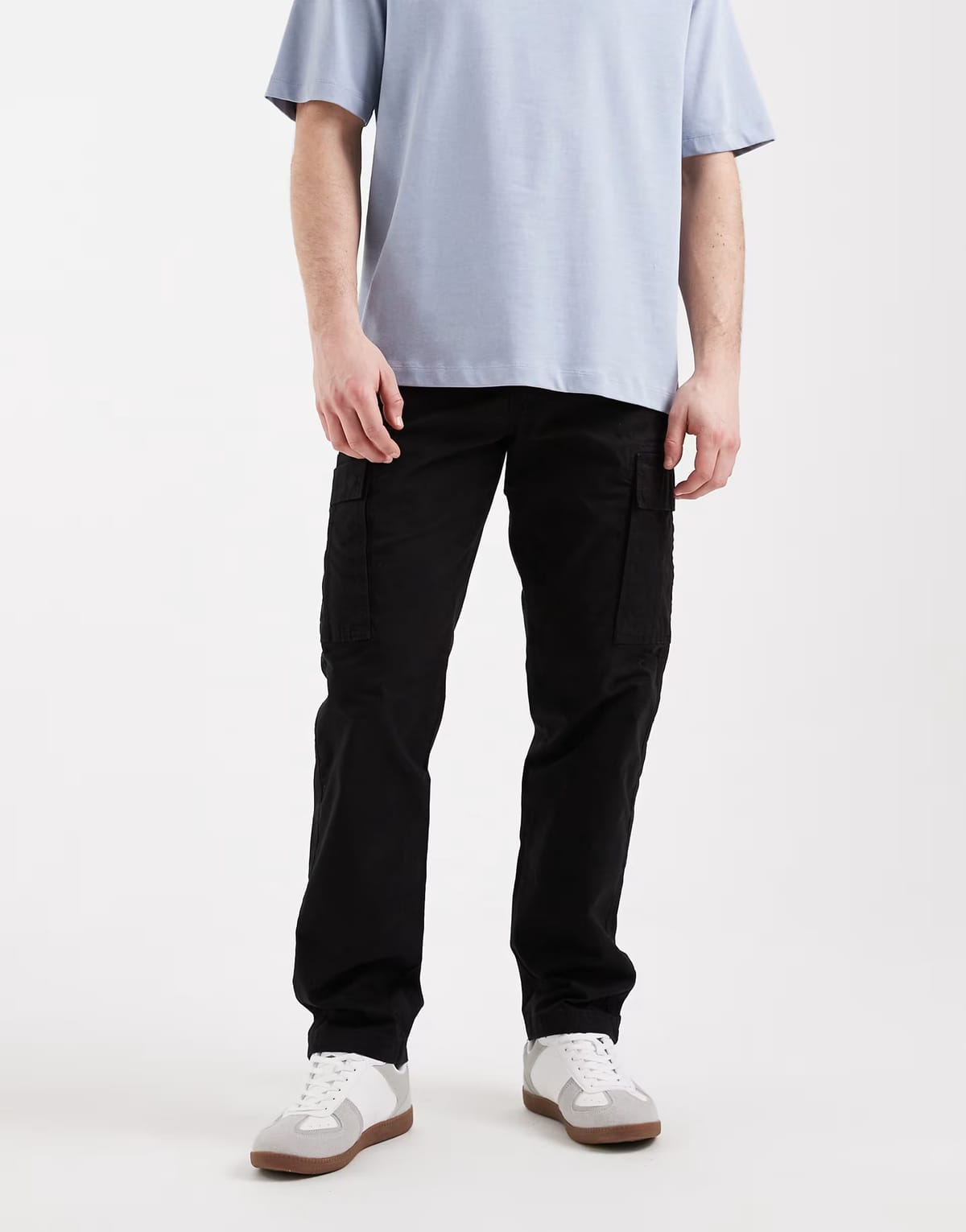 Crafted with a straight fit and cargo pockets, these black trousers are perfect for a casual yet stylish look. Made from durable fabric, they offer comfort and flexibility for everyday wear.