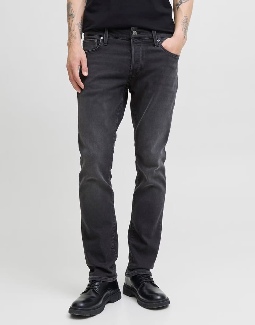 Stylish Jack & Jones tapered fit jeans in black denim. Featuring a classic straight leg and subtle distressing for a modern look. Perfect for casual wear.