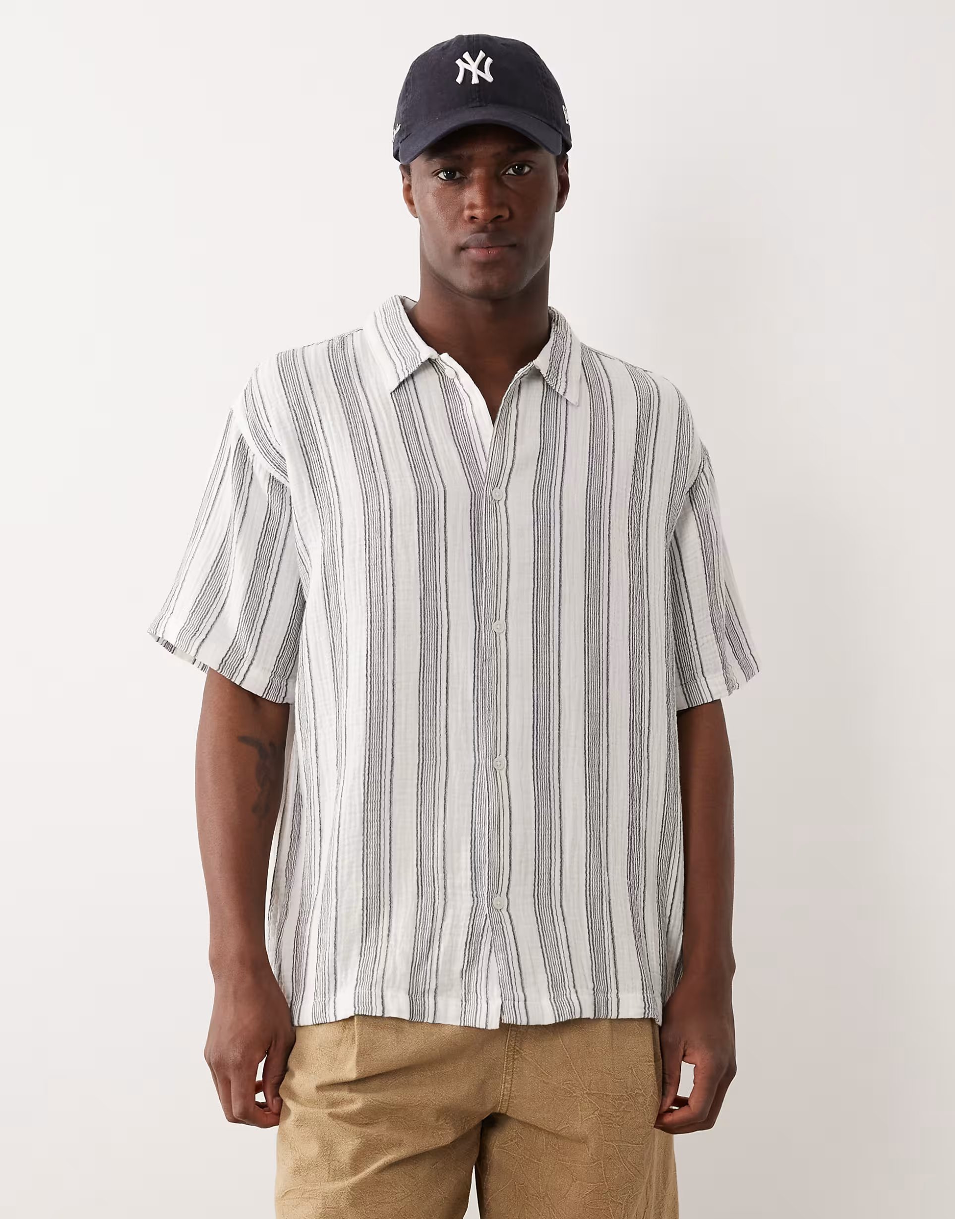 The ASOS Jack & Jones Textured Stripe Short Sleeve Shirt in Blue is made from cotton, polyester.
