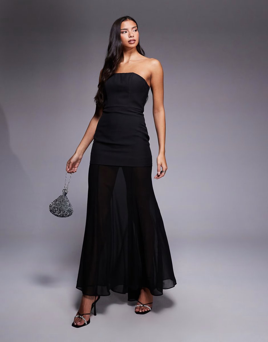 Elegant and ethereal, the Jarlo Cora strapless bandeau sheer skirt maxi dress in black features a sheer skirt and bandeau neckline for a sophisticated and striking look.