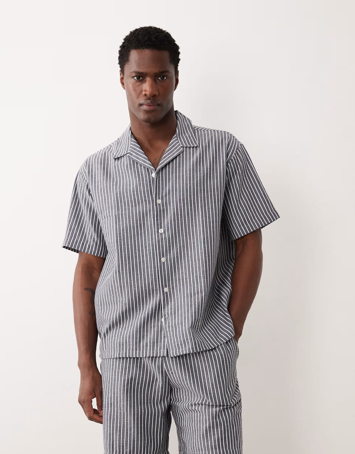 Casual ASOS navy striped seersucker shirt and shorts set in a lightweight fabric. The shirt features a classic collar, button-down front, and a relaxed fit. Paired with matching striped shorts for a coordinated look.