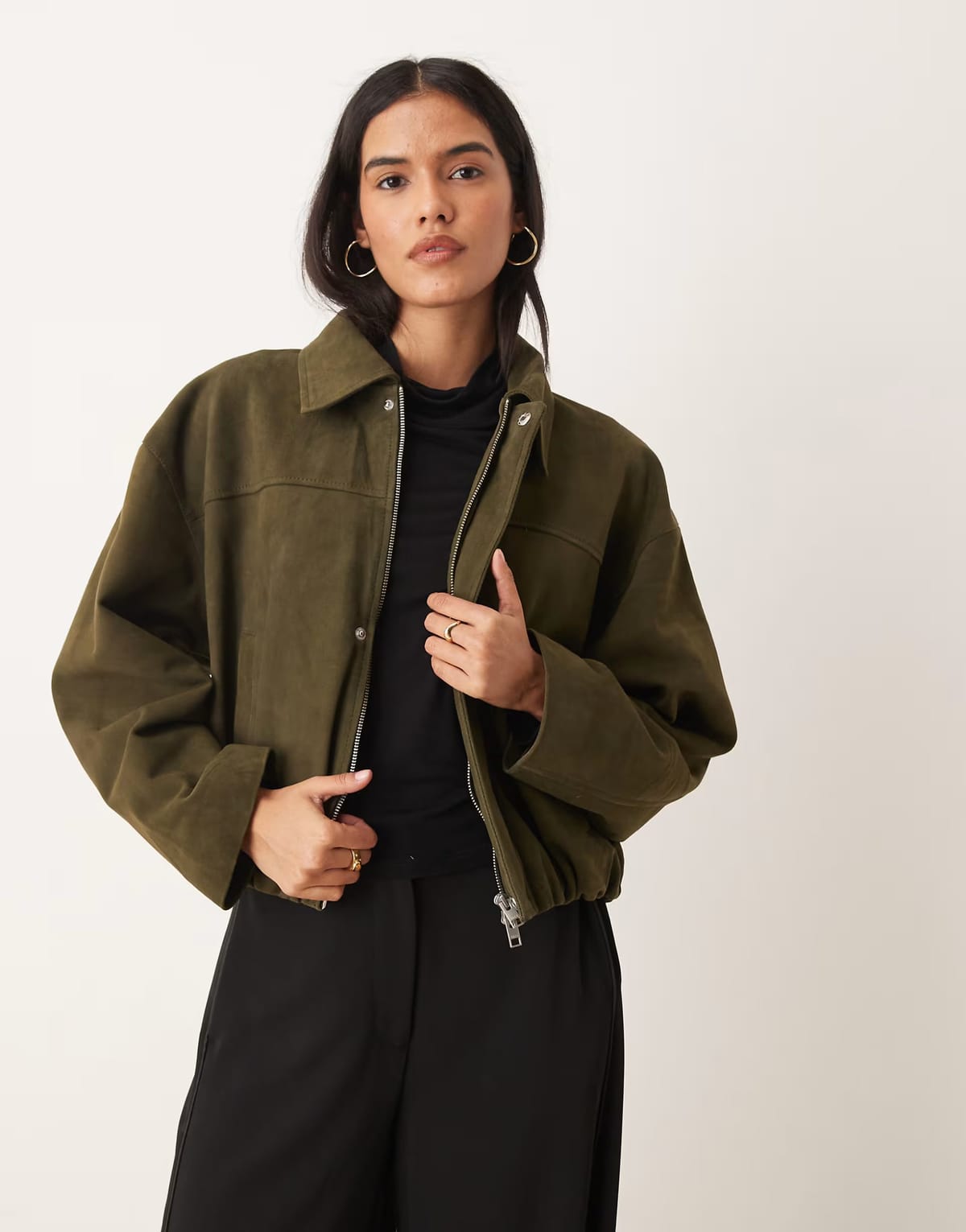 Stylish olive suede leather jacket by ASOS. Features a relaxed, oversized fit with a collared neckline and a zipper closure. Perfect for casual, everyday wear.
