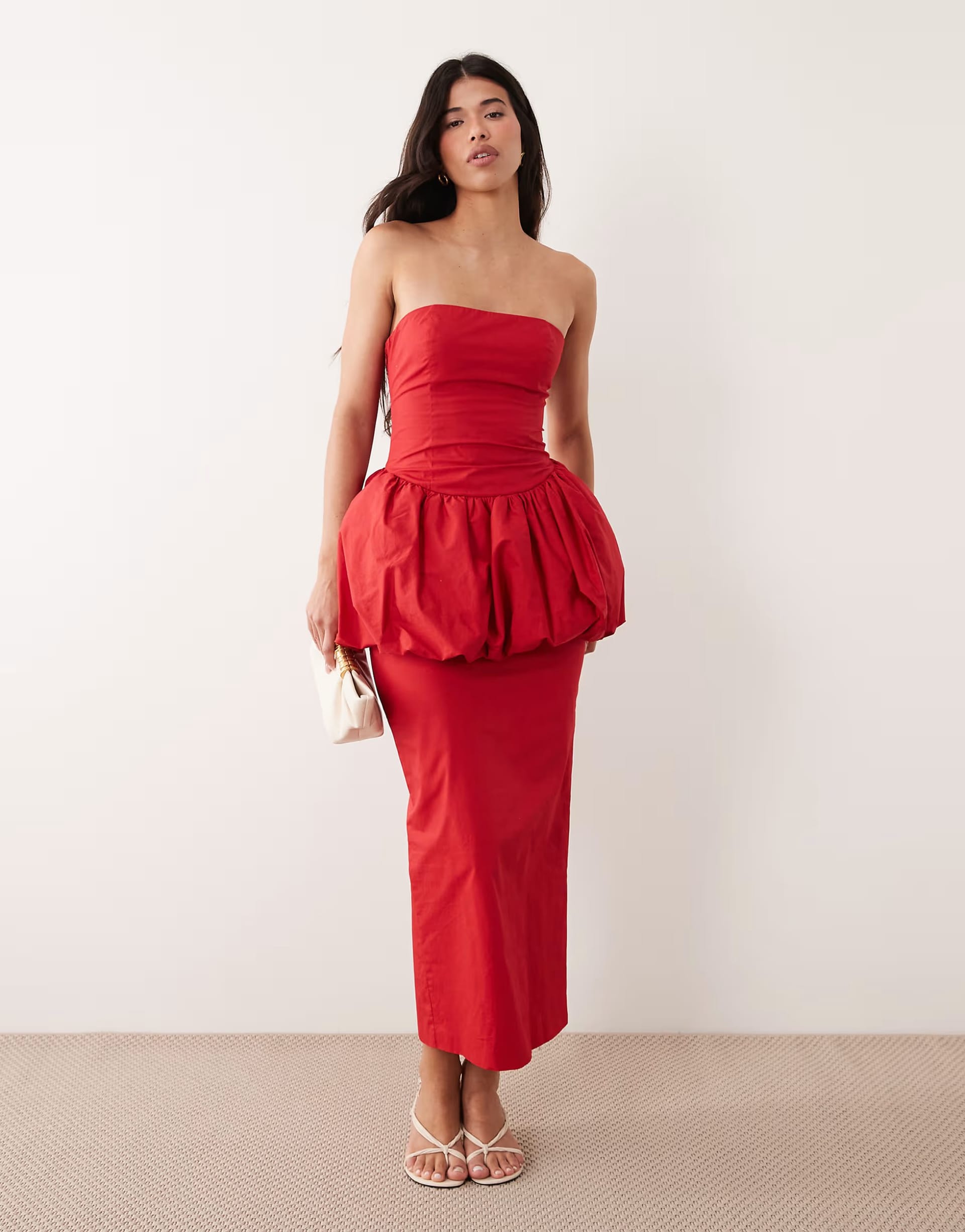 “Pair with red strappy heels and a clutch bag for a bold evening look.”