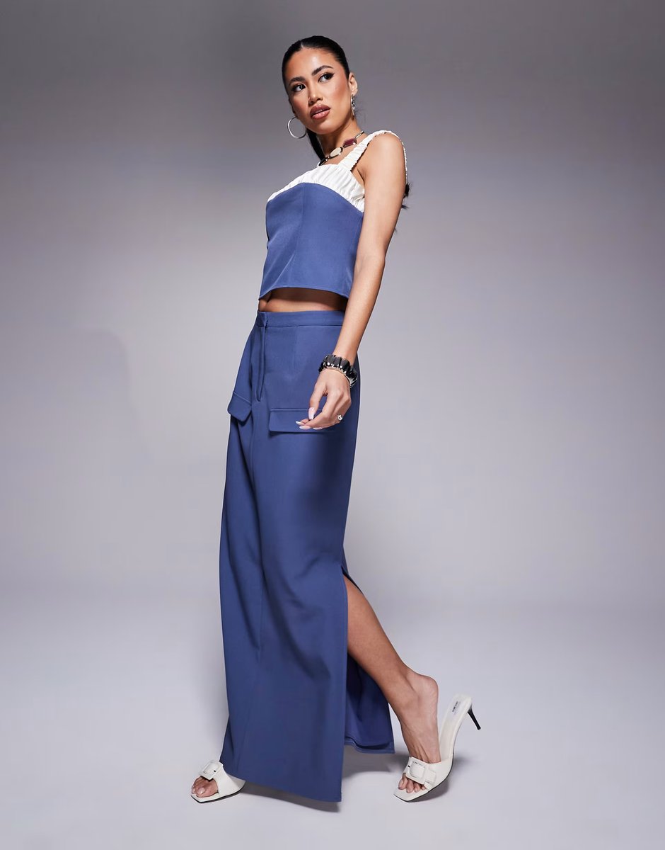 The ASOS Contrast Satin Cami Top and Ruched Skirt Co-ord in Blue is ideal for casual, work, weekend.