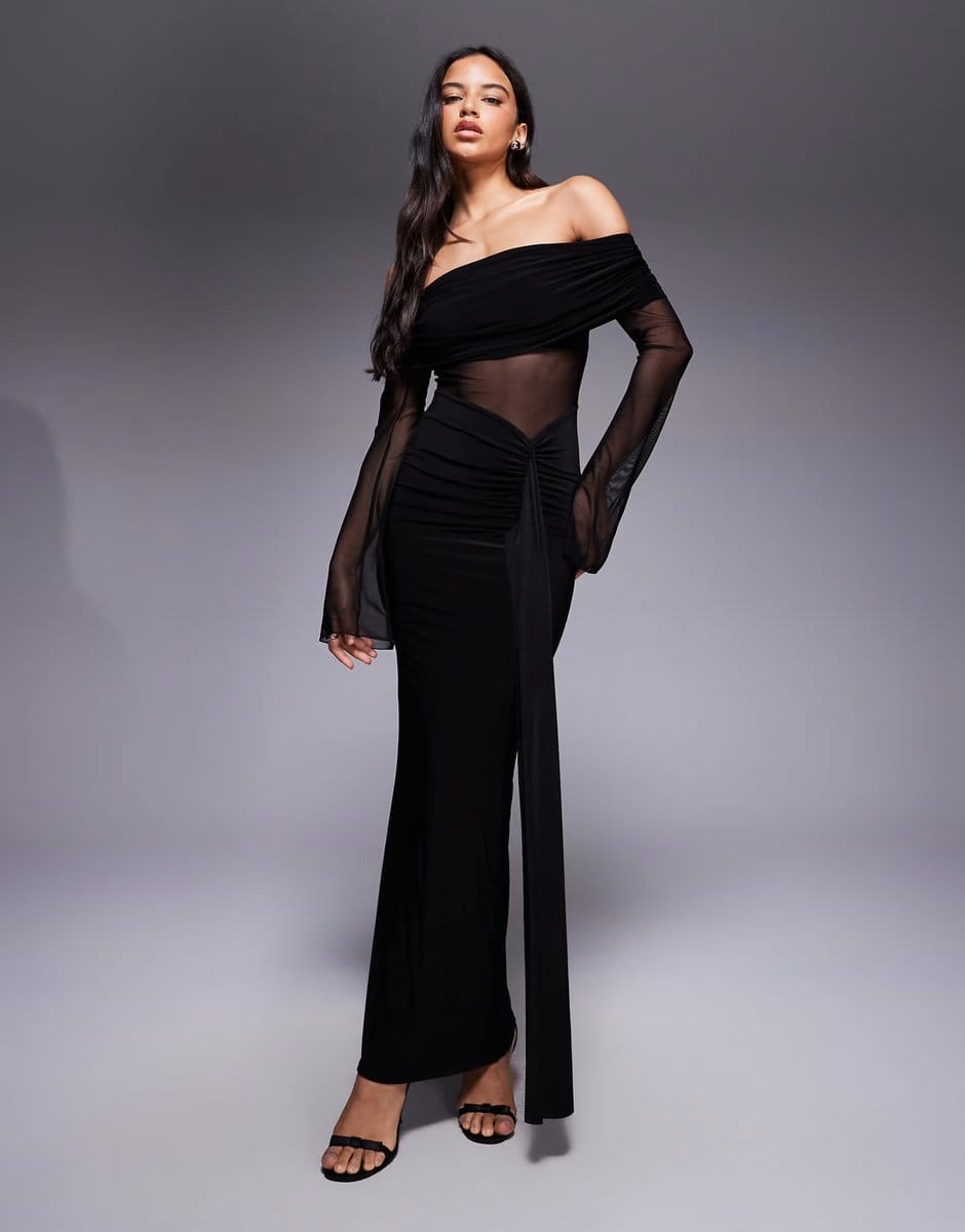 Crafted with double layers, slinky foldover bardot neckline, and sheer panel ruched skirt, this maxi dress in black offers a dramatic and elegant look. Perfect for evening events.