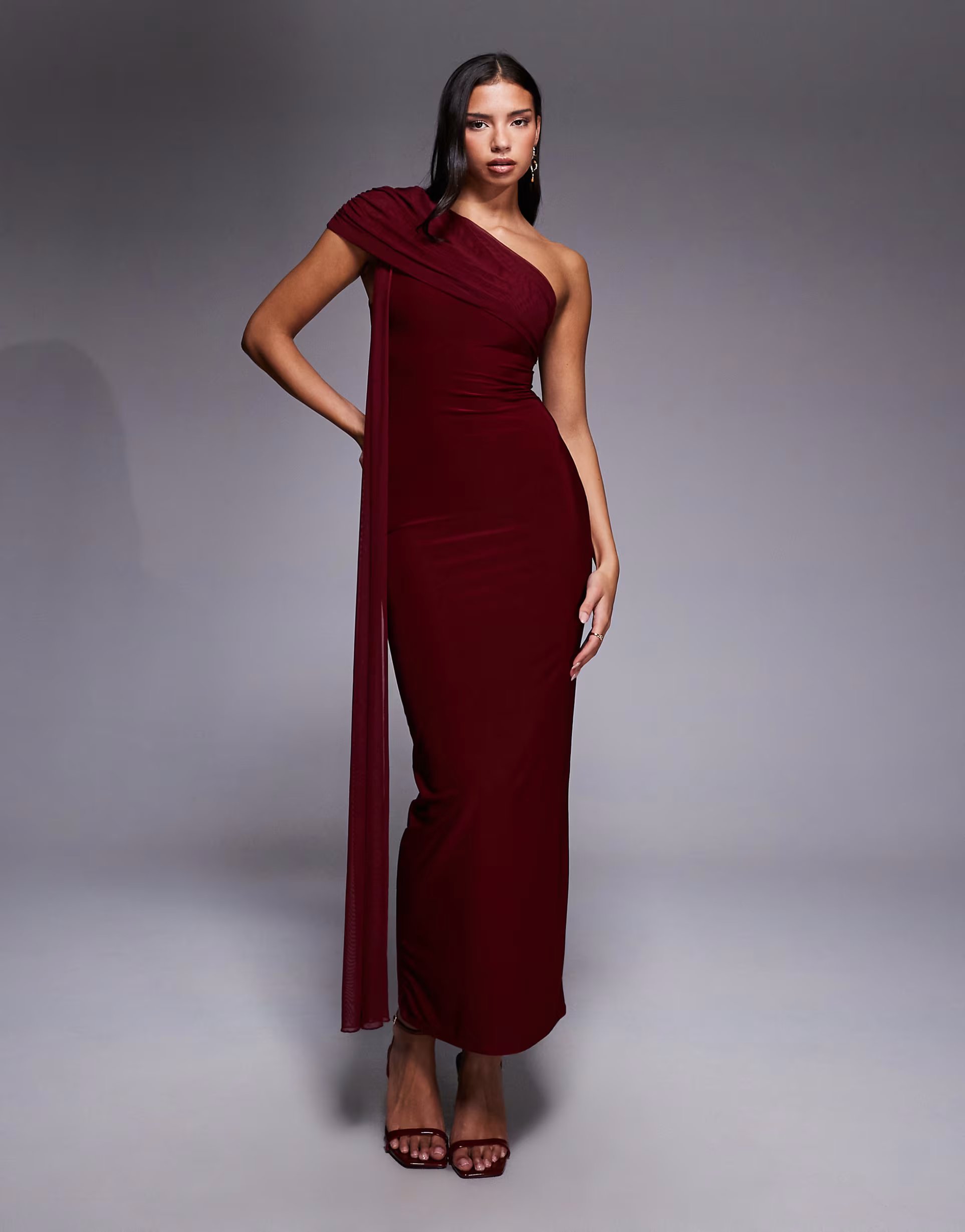 The ASOS Kaiia One-Shoulder Maxi Dress in Wine is available in sizes XXXL, XXL, XL, XS, L, M, S.