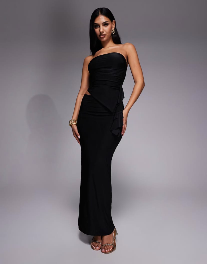 See all outfit ideasStylish black double layered maxi skirt co-ord by ASOS Kaiia. Features a slinky, stretchy fabric with a ruched top and ruffled side detail on the skirt. Perfect for evening events or special occasions.