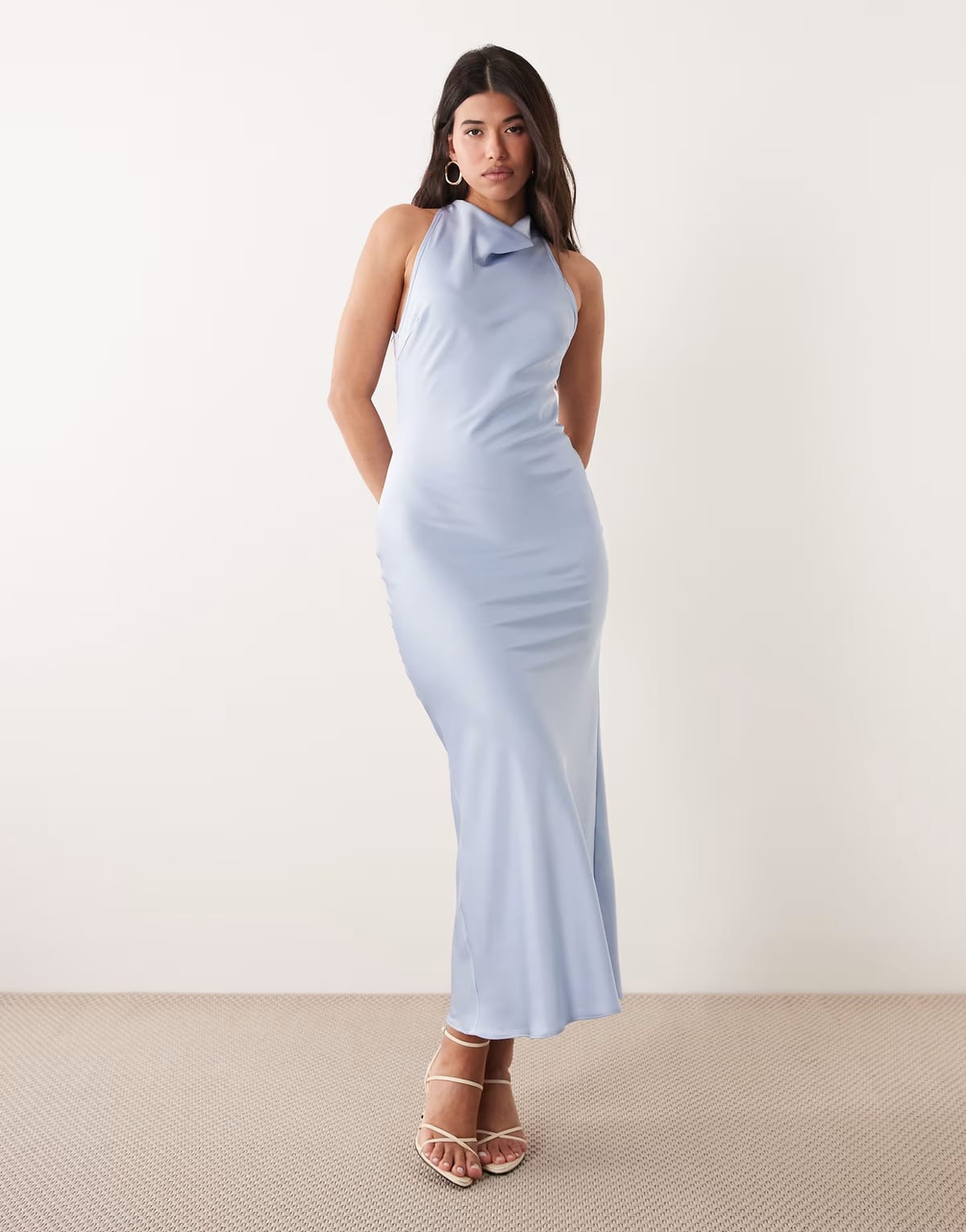 The ASOS Baby Blue Satin Cowl Neck Maxi Dress is made from satin.